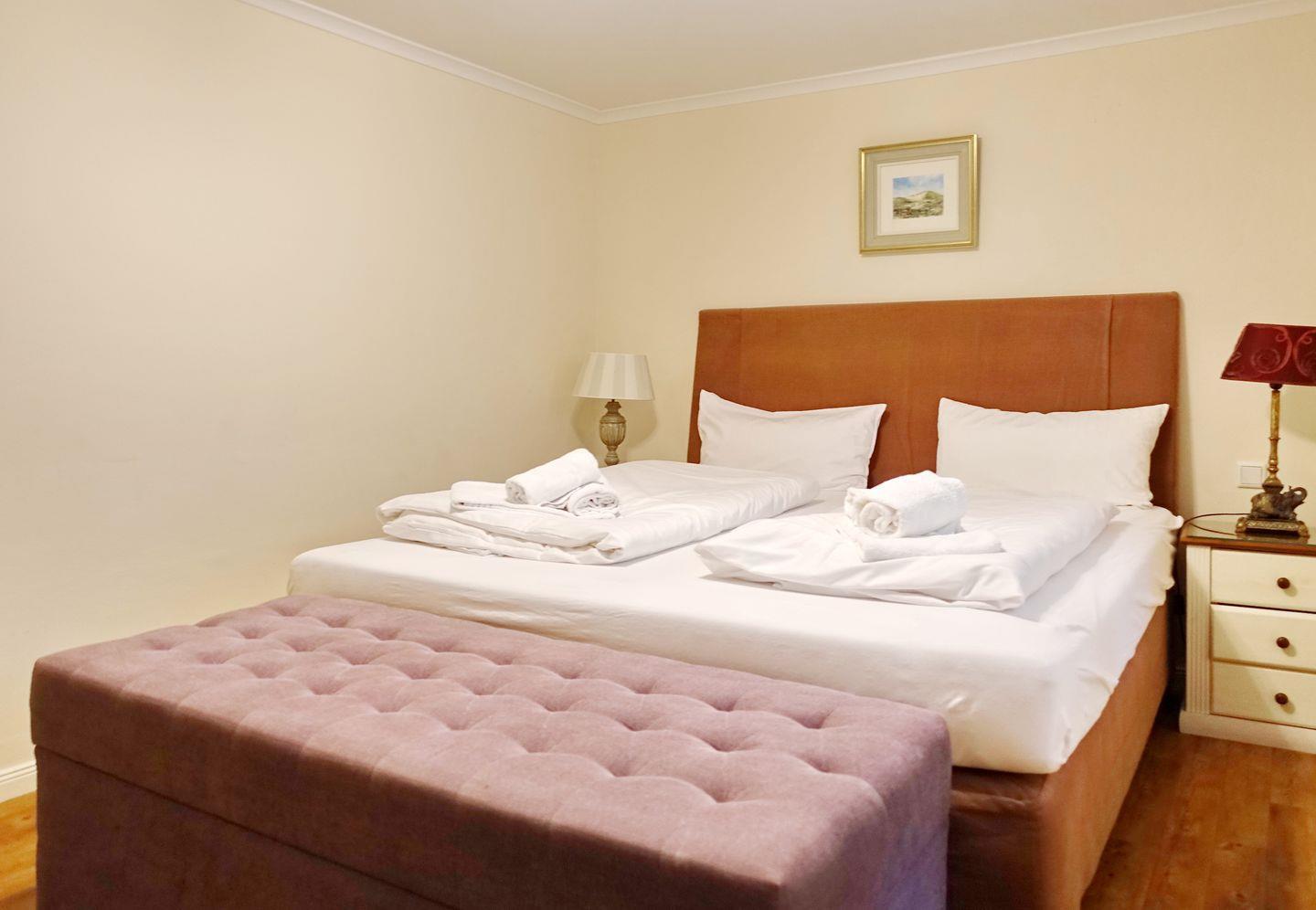 UG: Ein Raum mit Doppelbett (180x200cm) und TV. Badezimmer mit Dusche und WC.