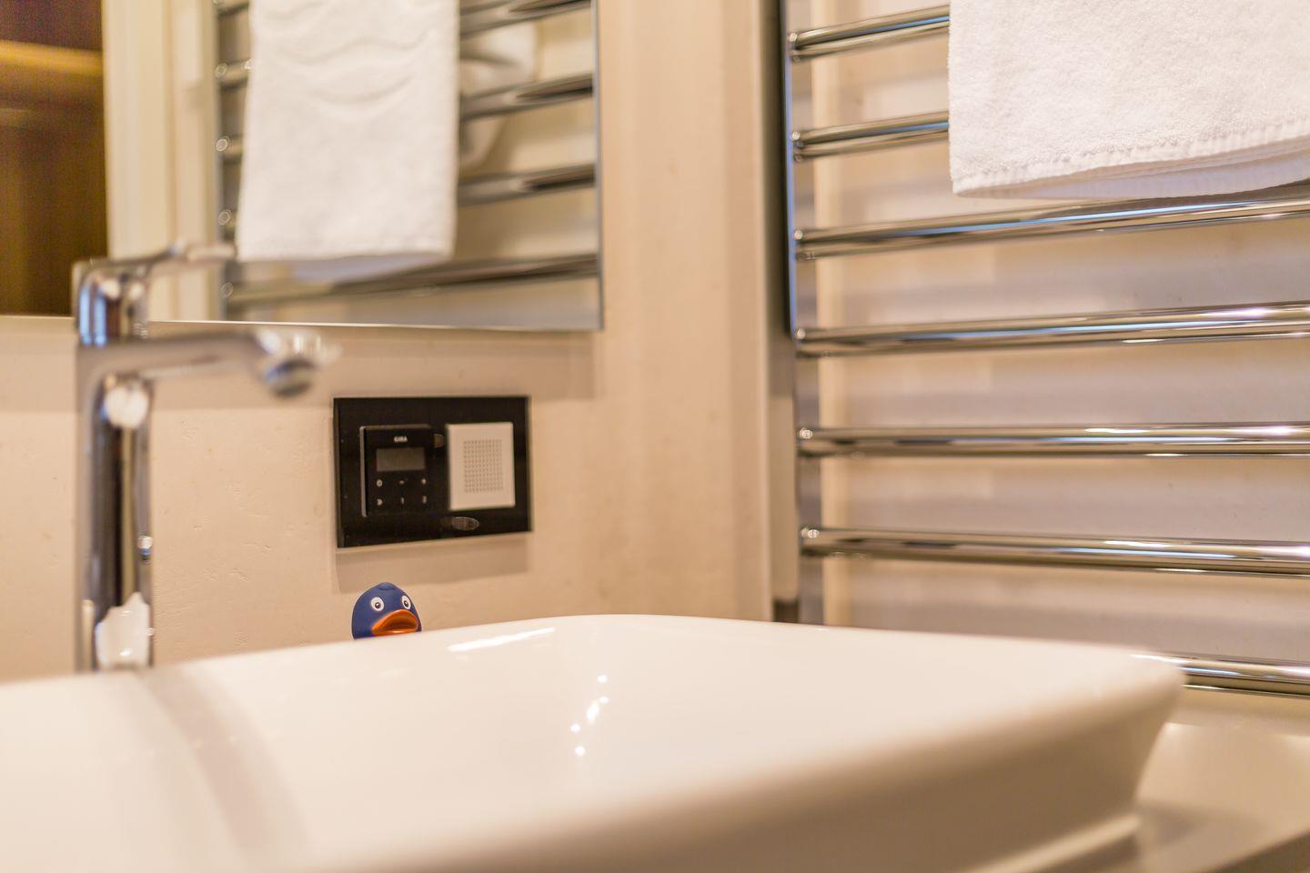 Von versierten Innenarchitekten gezeichnetes Wohlfühlbad mit großer Dusche, antikgeputzten Wänden (Farbton "Champagner", sehr edel !), WC und Waschmaschine. Das Wand-/Unterputzradio lässt Sie mit Ihrem Lieblingsradiosender beschwingt in den Tag starten.