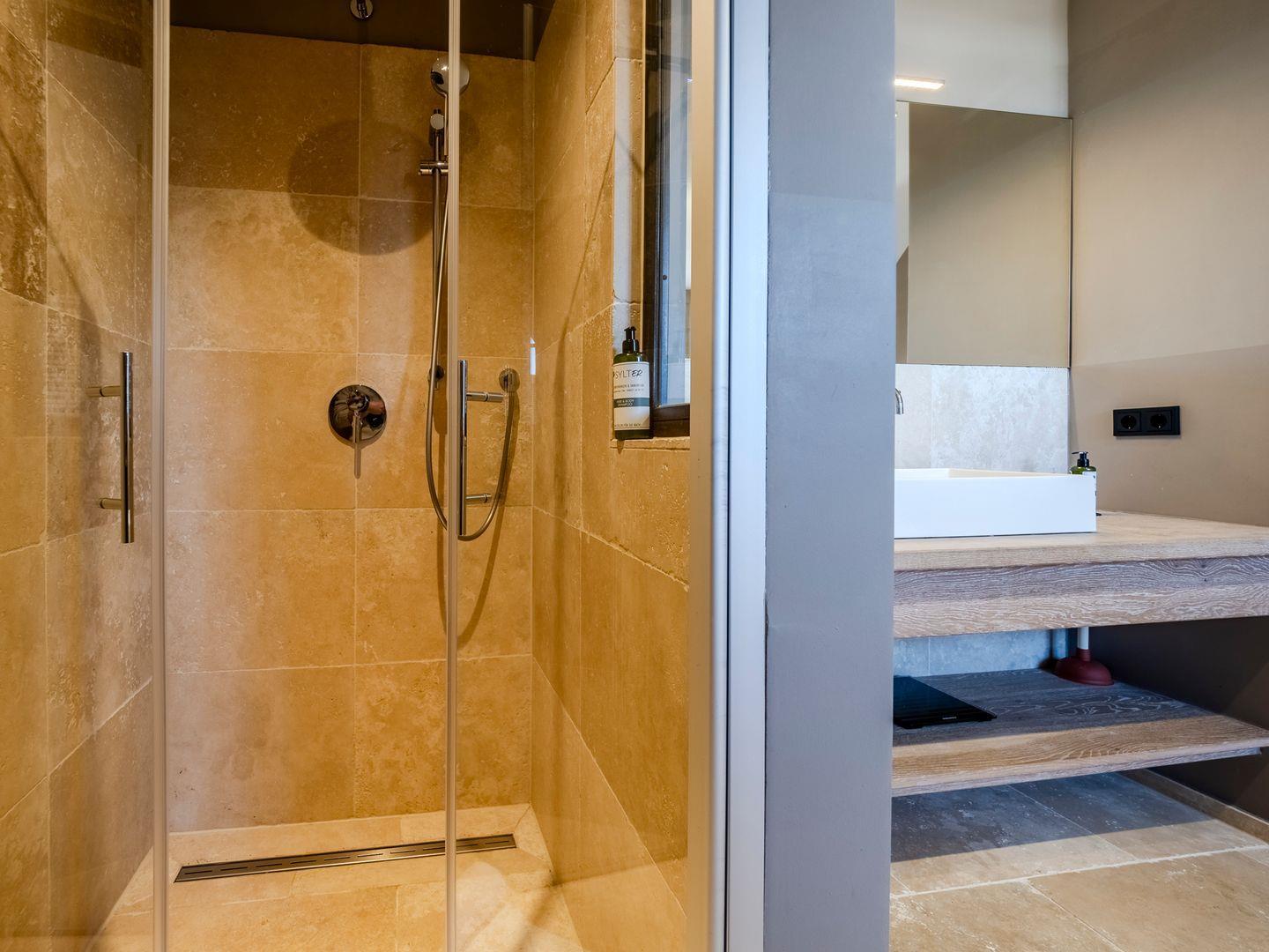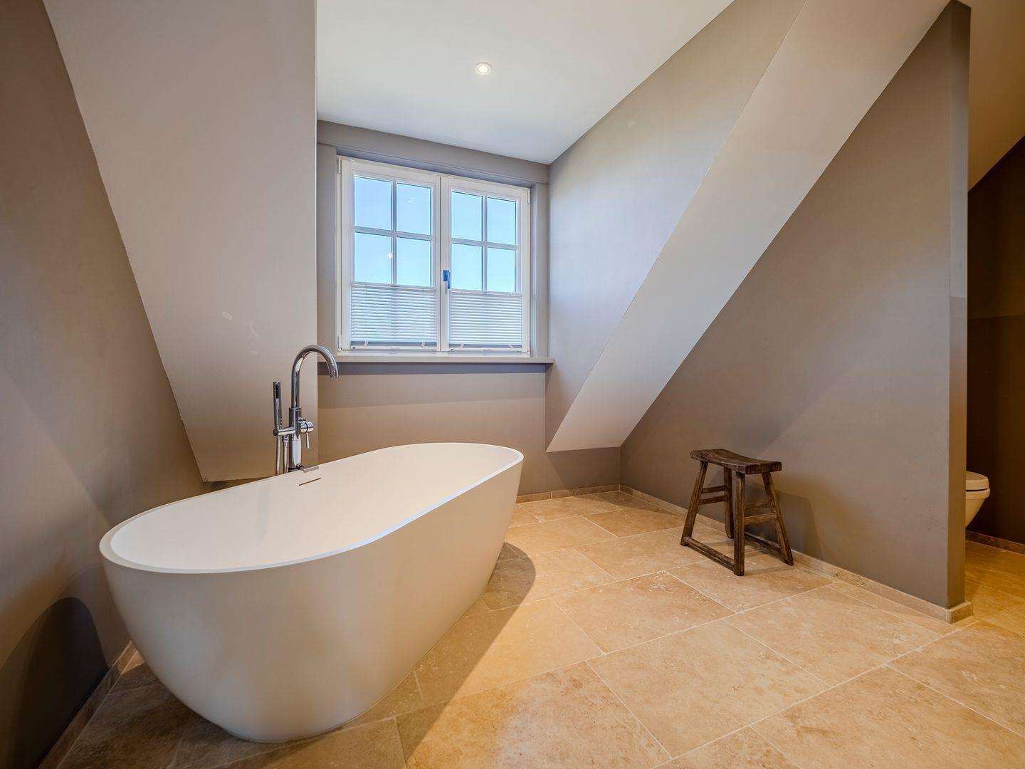 Zwei Badezimmer mit bodengleicher Regendusche, Handtuchtrockner und Fenster. Eines der Badezimmer verfügt zusätzlich über eine freistehende Badewanne, Radio und Meerblick.