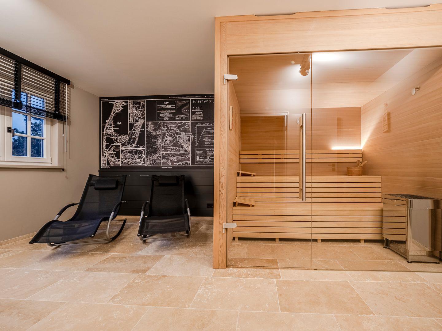 Großzügige Sauna mit schönem Ruhebereich und zwei Liegemöglichkeiten.