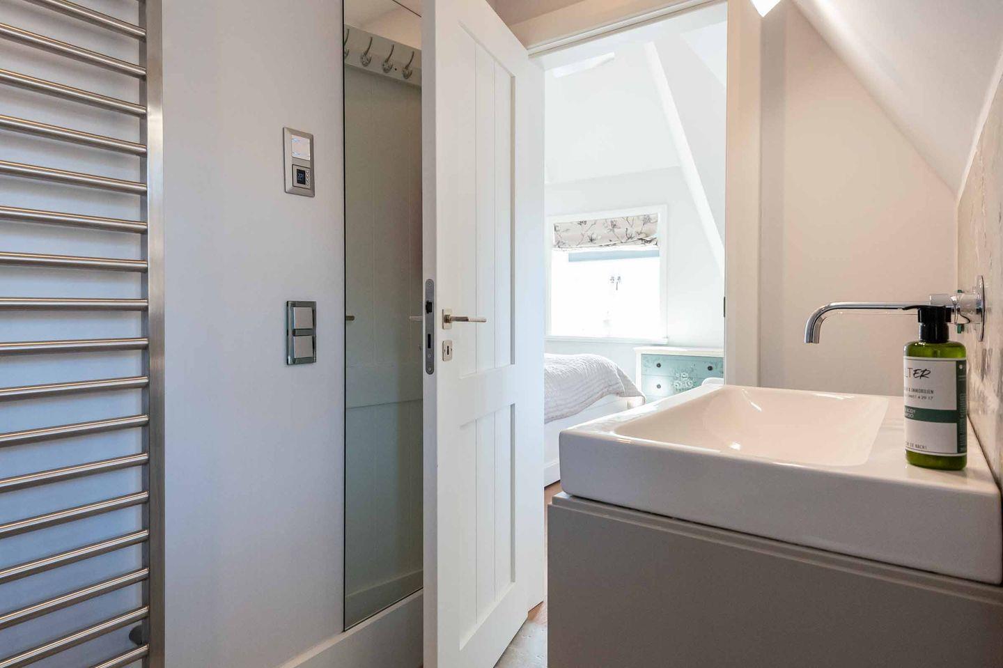 Drei helle und bodengleiche Duschbäder mit Regenduschkopf, Handtuchtrockner und Fenster. Eines der Badezimmer ist zusätzlich mit einer Badewanne ausgestattet und grenzt an die Sauna und einen kleinen Ruhebereich.