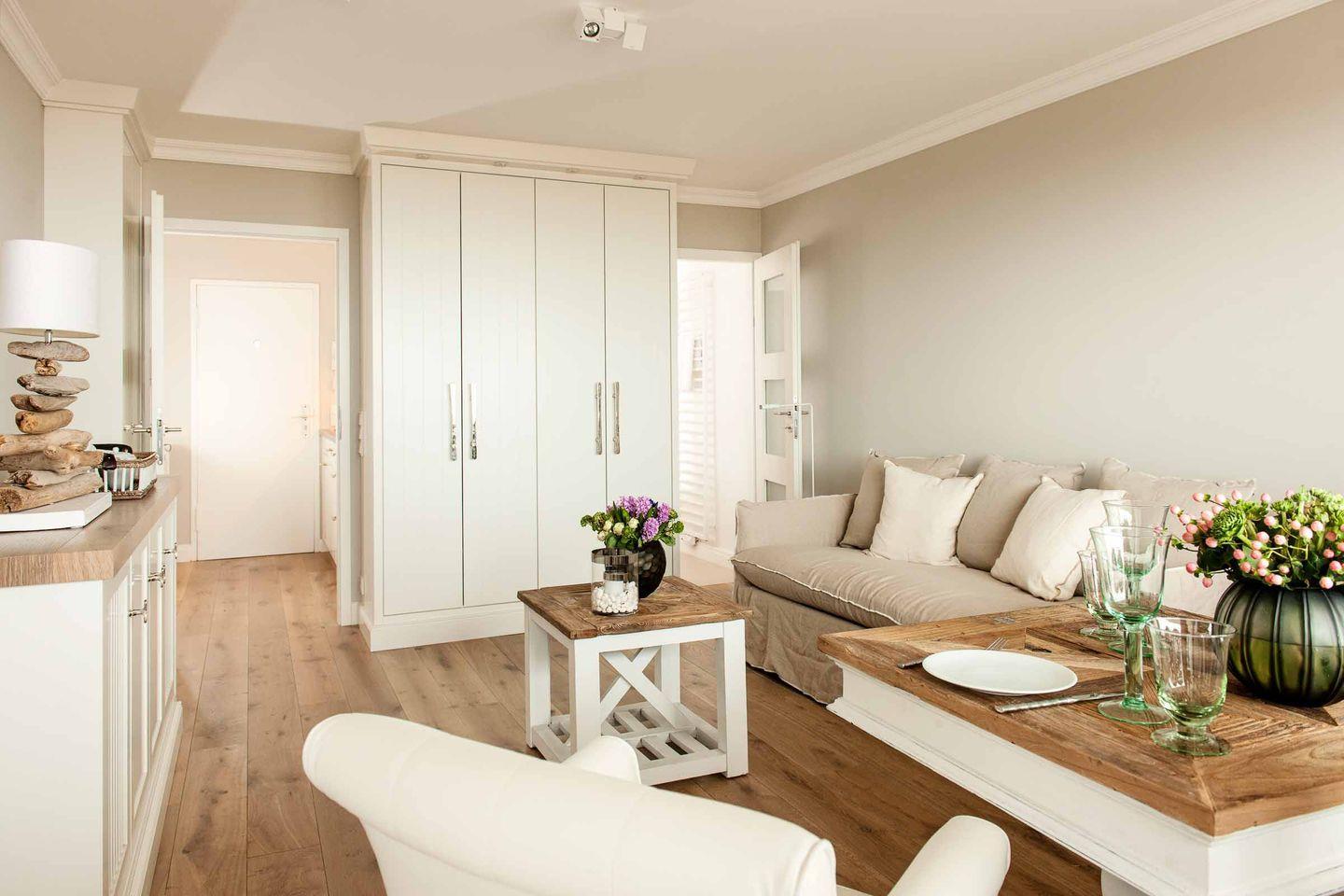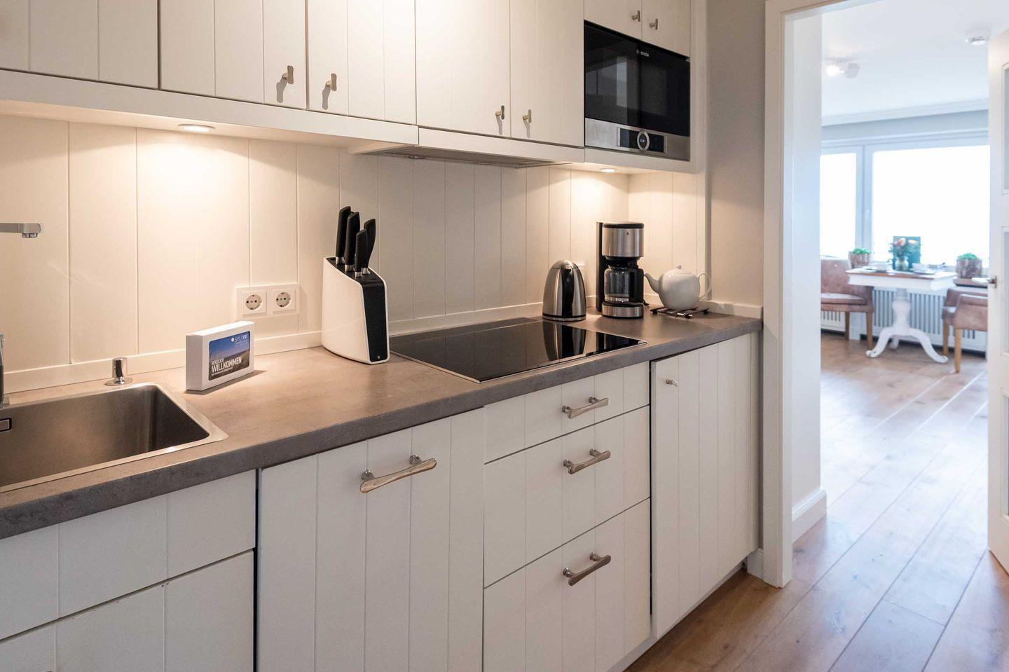 Küche und Flur: Helle, gut ausgestattete Pantryküche mit Spülmaschine, Mikrowelle und Induktions-Kochfeld im Eingangsbereich. Der Flur bietet Platz für eine Garderobe und eine kleine Ablagefläche.
