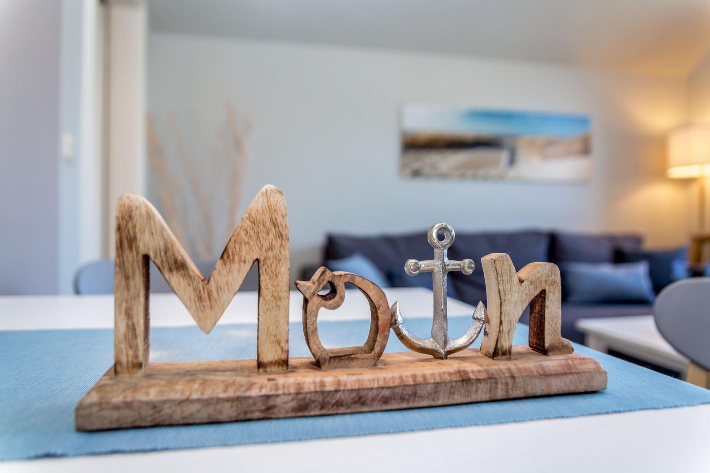 Der Wohnbereich ist offen und freundlich gestaltet. Große Fenster lassen viel Tageslicht herein und öffnen den Blick in den Garten. Die Sofaecke lädt dazu ein, den Tag ruhig zu beginnen oder ihn am Abend entspannt ausklingen zu lassen. Draußen stehen Strandkörbe bereit – für kleine Pausen an der frischen Nordseeluft.