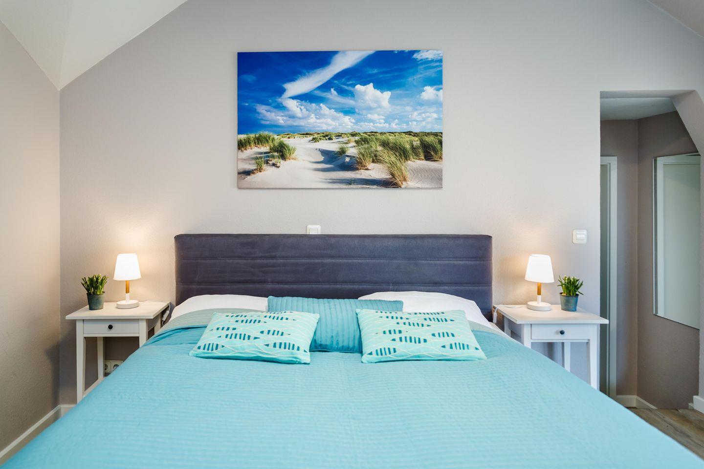 Das Schlafzimmer liegt zur geschützten Rückseite des Hauses. Ein breites Boxspringbett und ausreichend Stauraum sorgen für Komfort und erholsame Nächte. Direkt angrenzend befindet sich ein Tageslichtbad, hell und angenehm schlicht gestaltet.