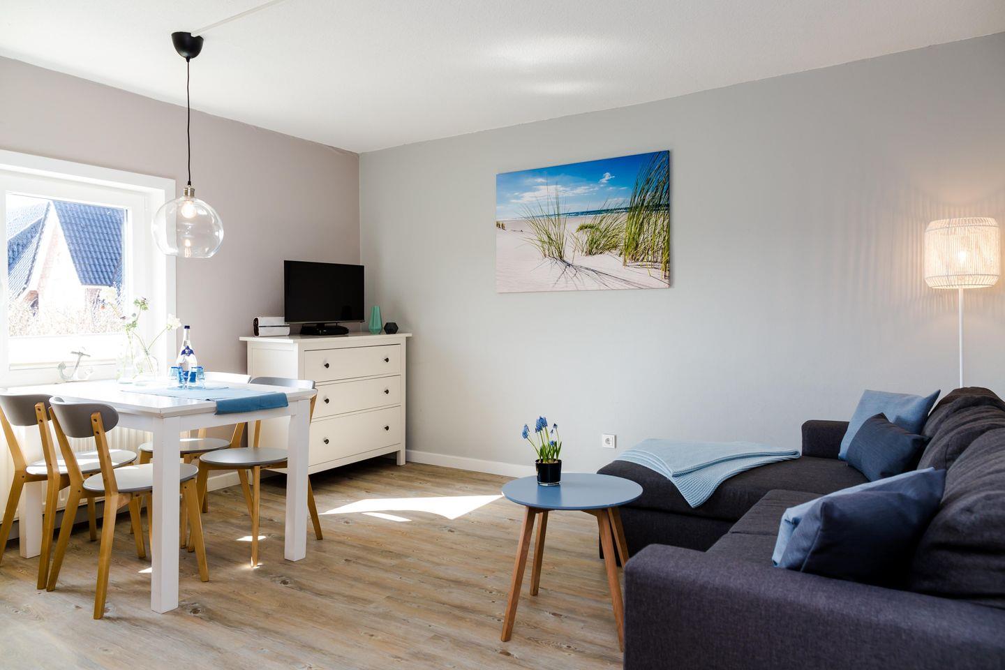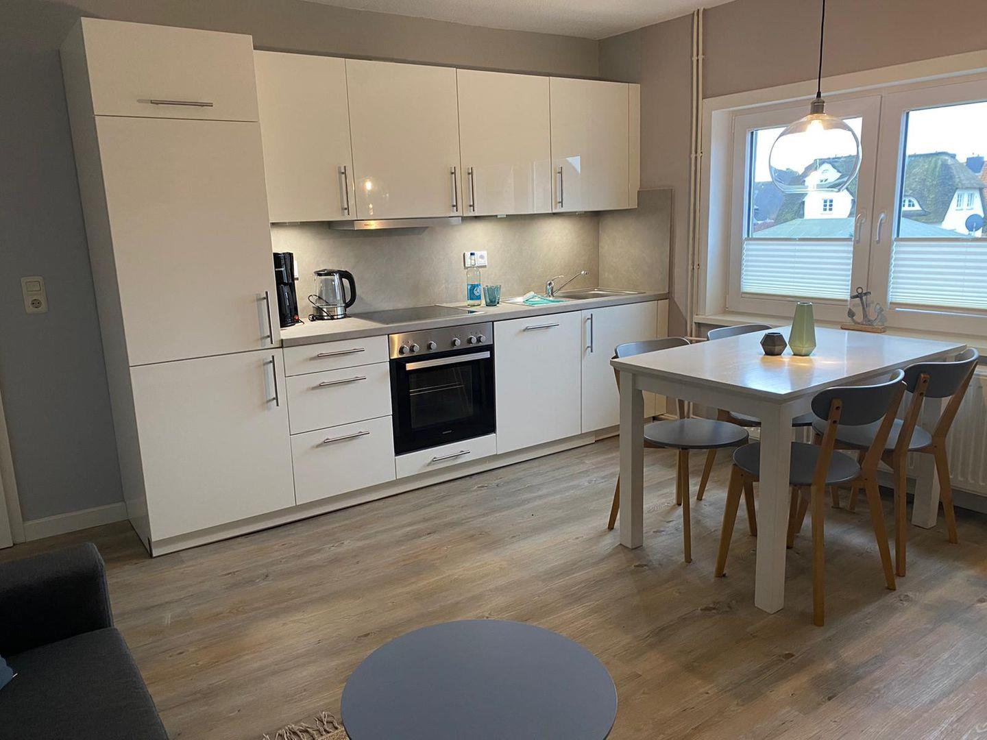 Der Wohnbereich ist offen gestaltet und lichtdurchflutet. Helle Farben, klare Linien und eine gemütliche Sofaecke schaffen einen Raum, in dem man gern verweilt – morgens bei einer Tasse Kaffee, abends bei einem Glas Wein. Der Tisch im Wohnbereich ist ein schöner Ort für gemeinsame Mahlzeiten, Gespräche oder einen ruhigen Start in den Tag. Die voll ausgestattete Küche bietet alles, was es für eine unkomplizierte Selbstversorgung braucht – praktisch, gut organisiert und angenehm integriert.