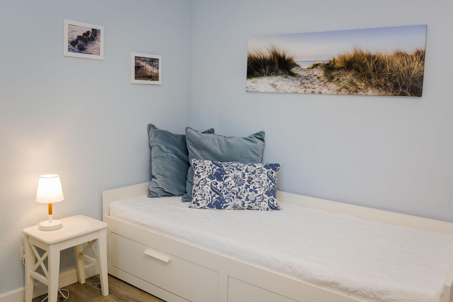 Das Schlafzimmer ist freundlich und ruhig gestaltet. Ein Doppelbett und ein Einzelbett bieten flexible Schlafmöglichkeiten und machen das Möwennest zu einem angenehmen Rückzugsort – auch nach einem langen Tag an der frischen Nordseeluft.
