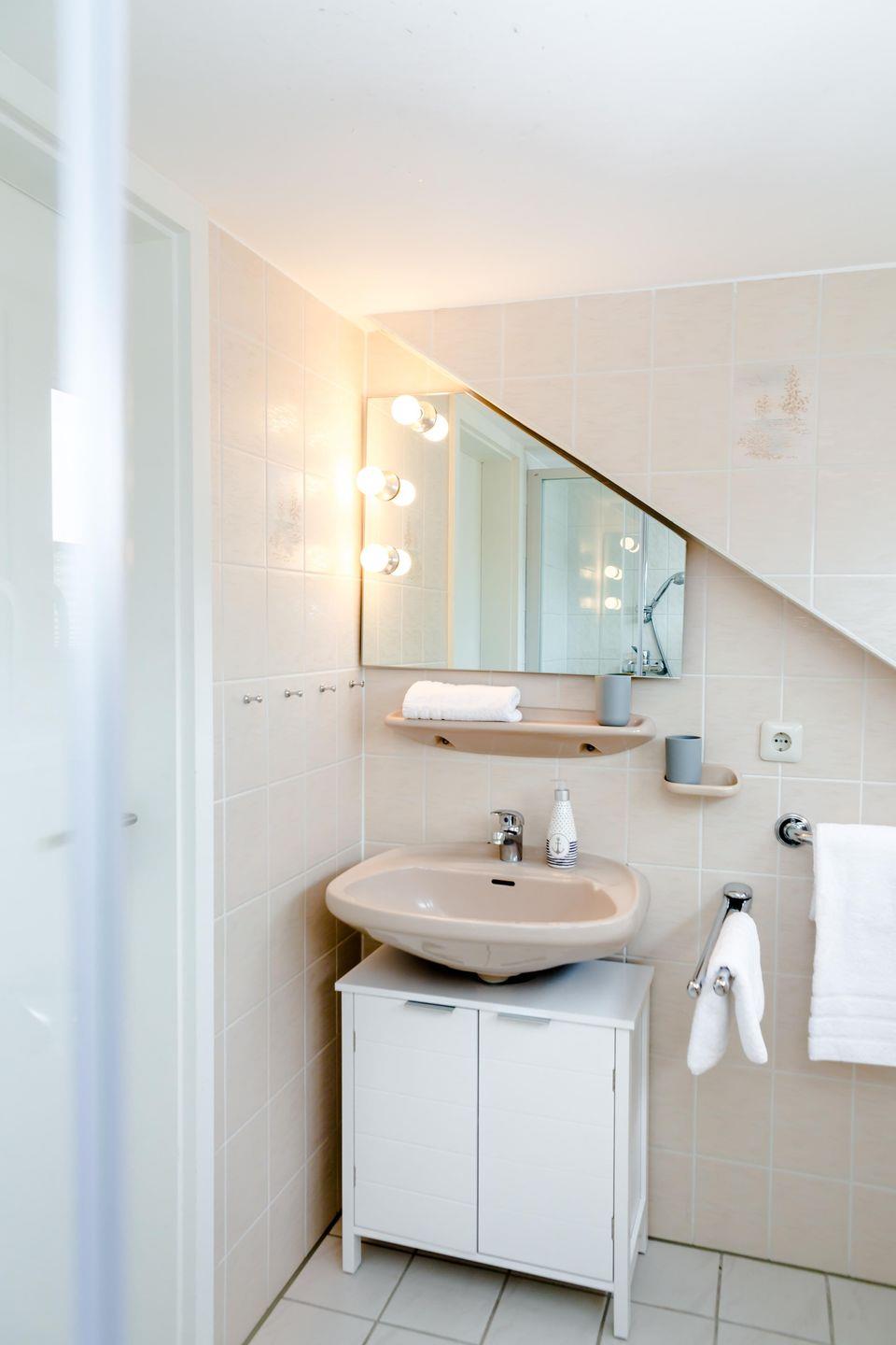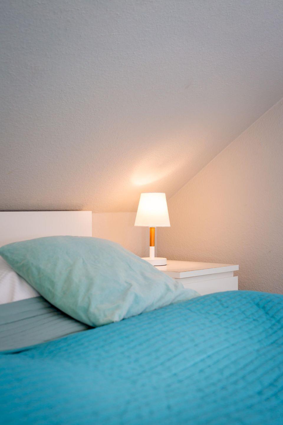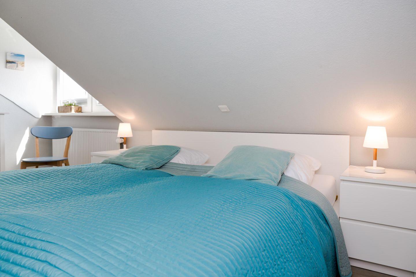 Das Schlafzimmer mit Doppelbett liegt angenehm ruhig und bietet ausreichend Stauraum. Das Badezimmer ist hell gestaltet und sorgt mit Tageslicht für einen frischen Start in den Tag.