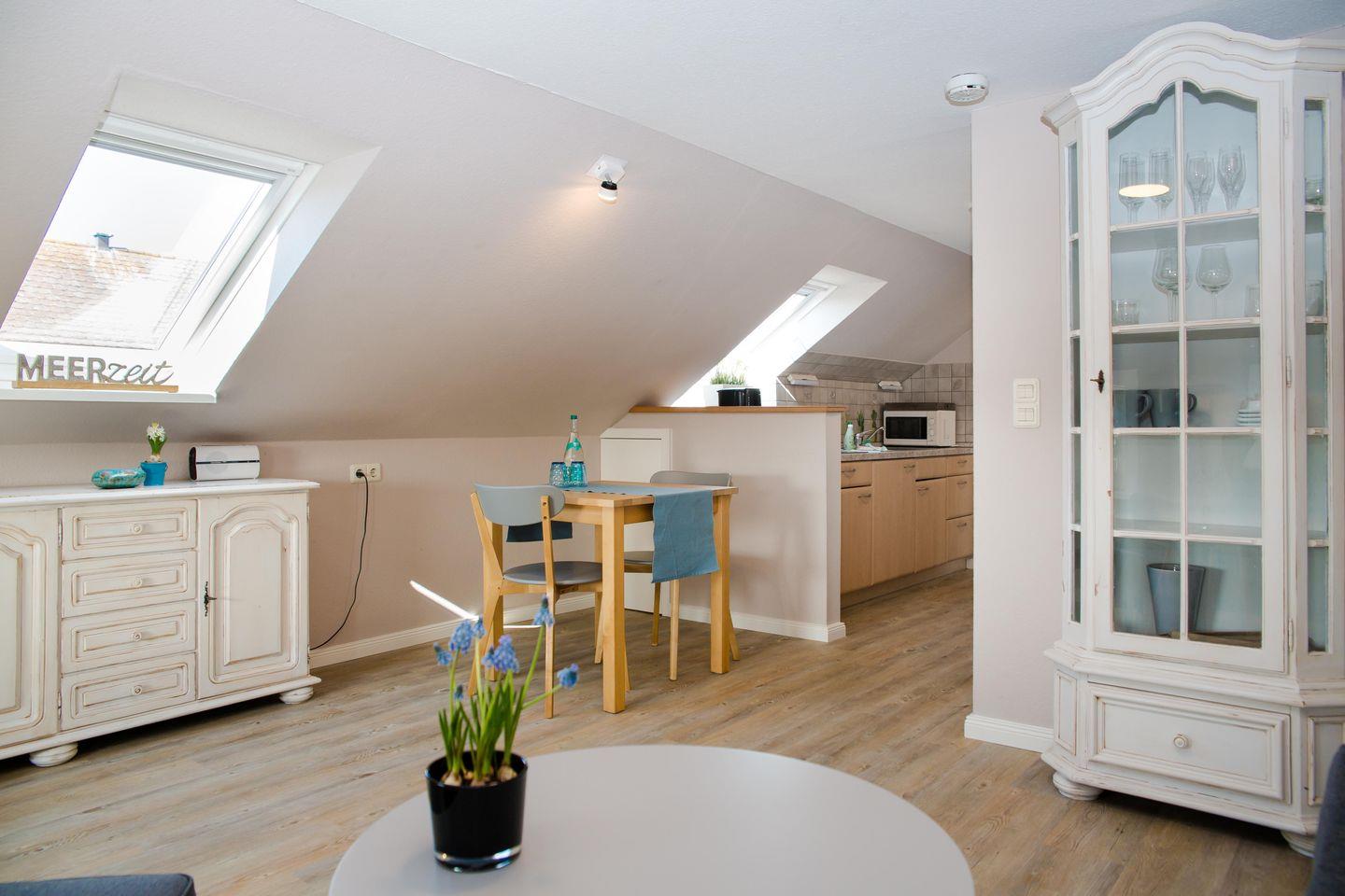 Das helle Wohnzimmer wirkt offen und gemütlich zugleich. Licht fällt aus mehreren Richtungen hinein, die Räume greifen ineinander, ohne ihre Geborgenheit zu verlieren. Helle Farben, friesische Akzente und die besondere Aufteilung schaffen dieses typische Sylt-Gefühl: ruhig, entspannt, ein bisschen eigen – und genau richtig. Die offene Küche fügt sich selbstverständlich in den Wohnbereich ein und lädt dazu ein, den Tag entspannt zu beginnen oder ausklingen zu lassen.
