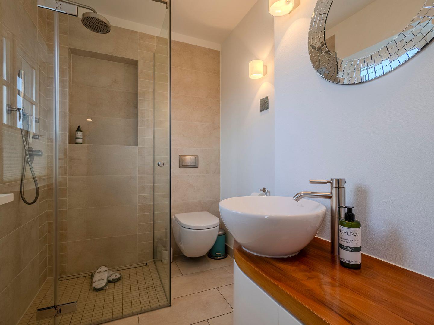 Badezimmer 1: Bodentiefe Dusche, WC, Waschbecken und Fenster.