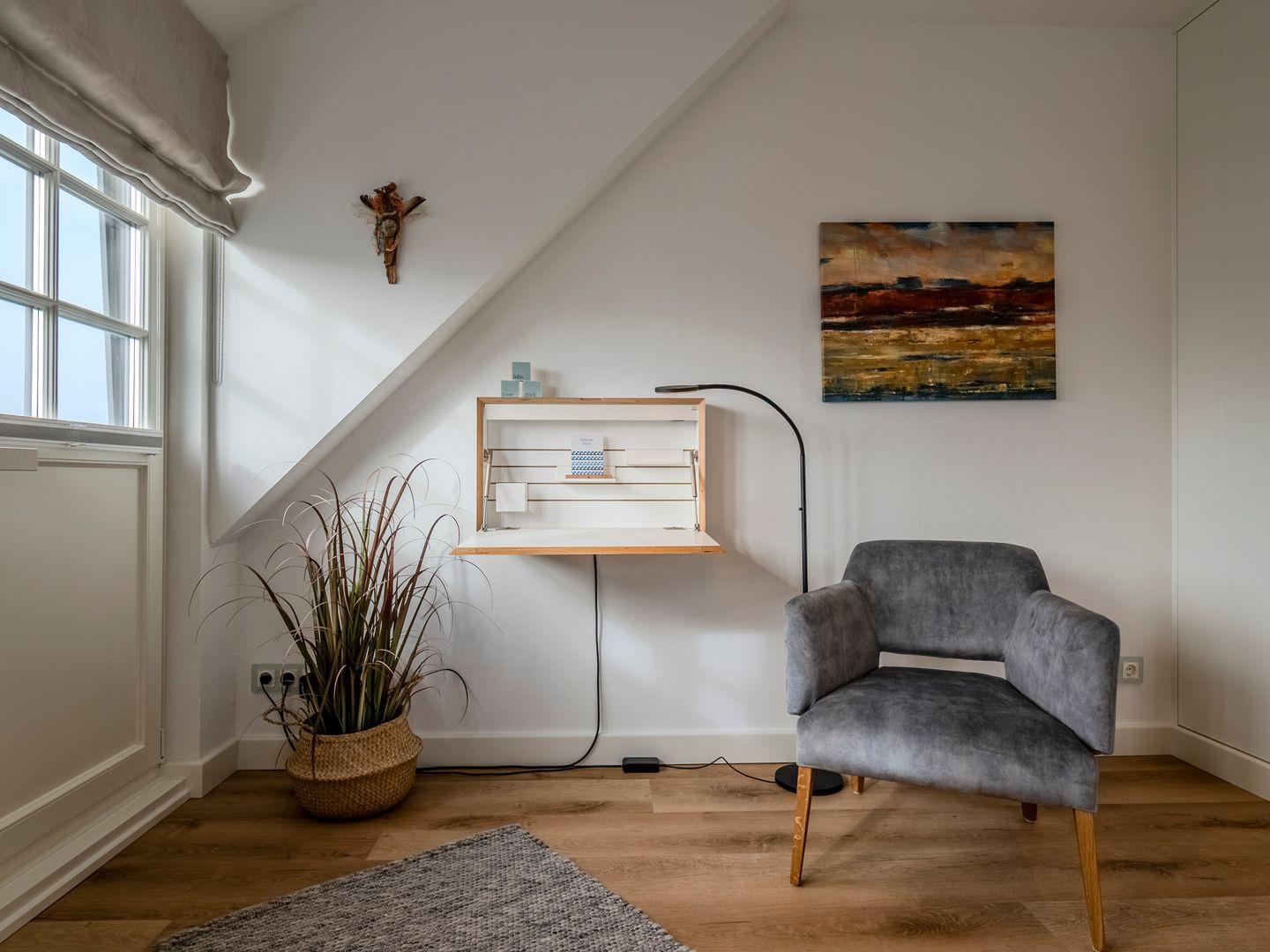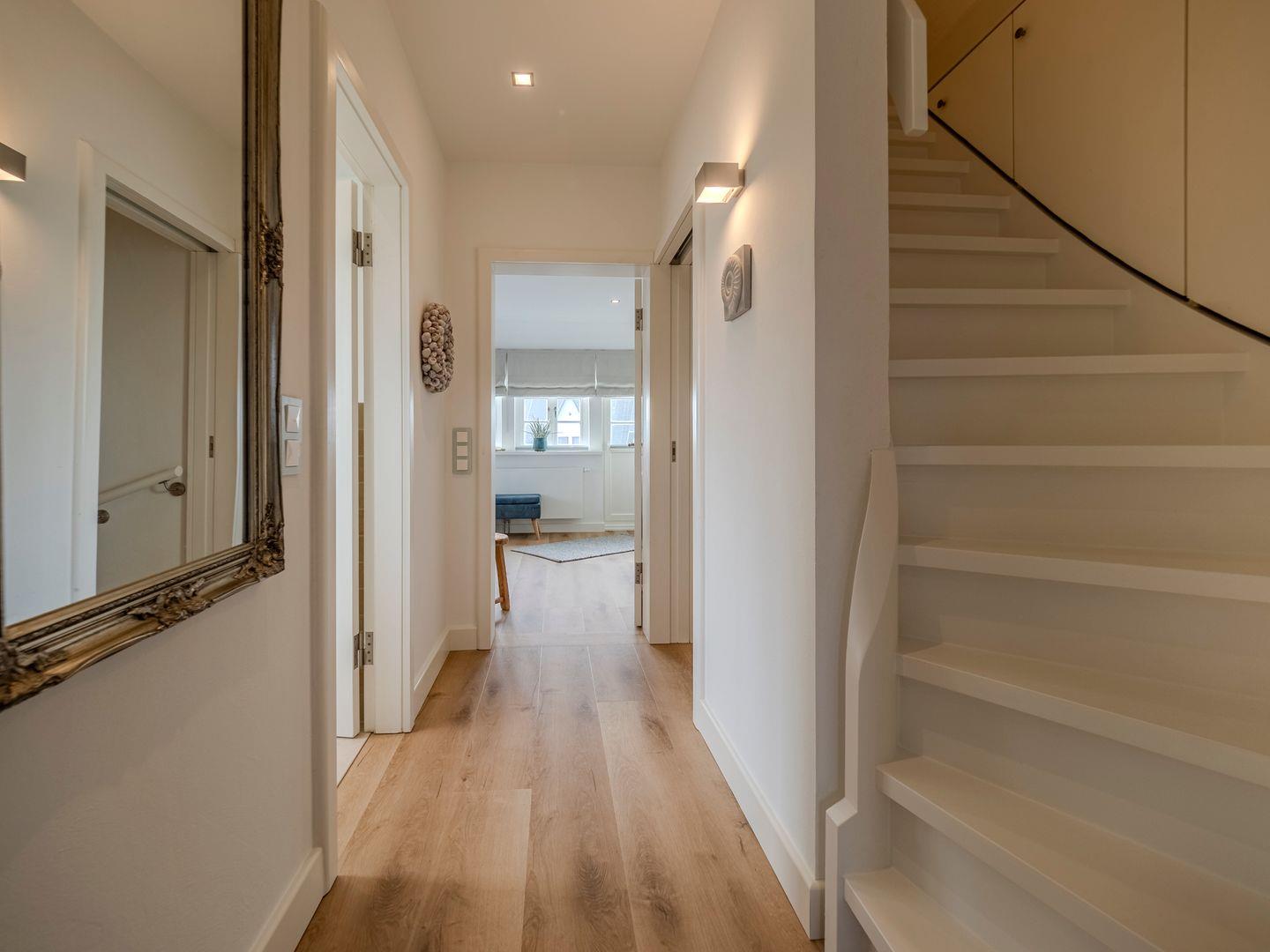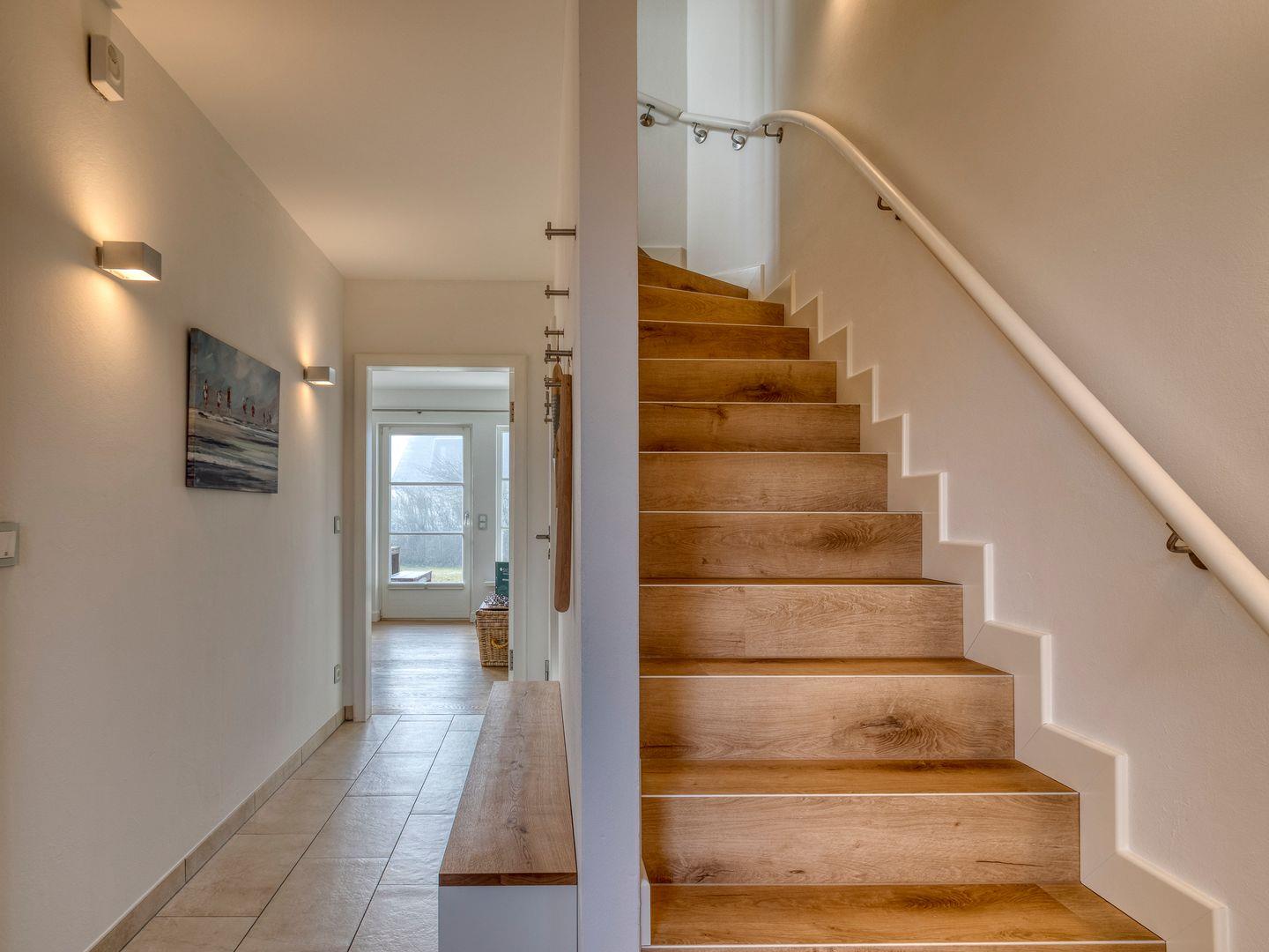 Vom Flur führt eine Treppe in das helle und exklusiv eingerichtete Obergeschoss. Am oberen Treppenabsatz können Sie eine Schiebetür zuziehen.