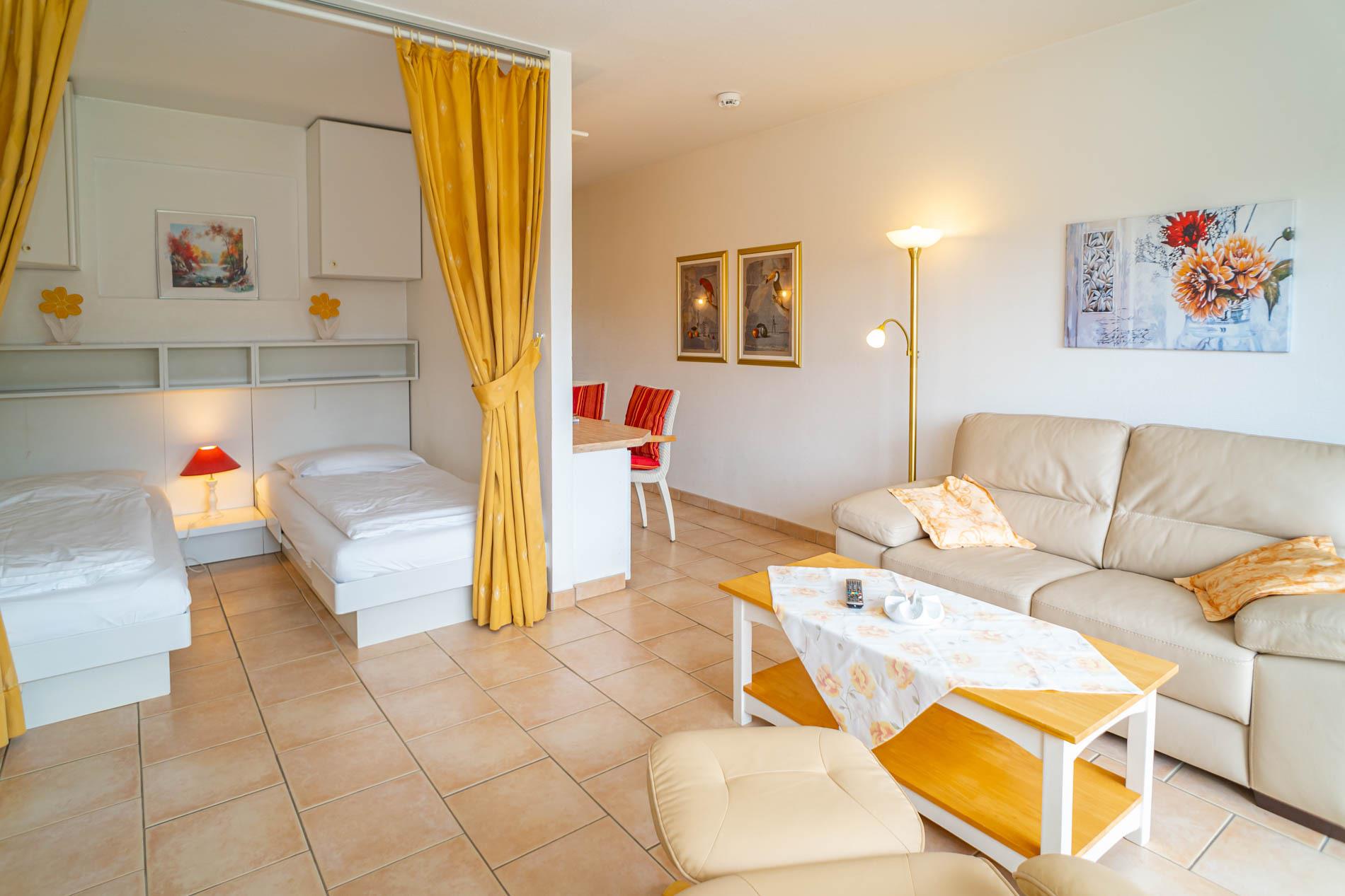 Die Schlafnische ist mit 2 Einzelbetten ausgestattet und kann durch einen Vorhang vom Wohnbereich getrennt werden.