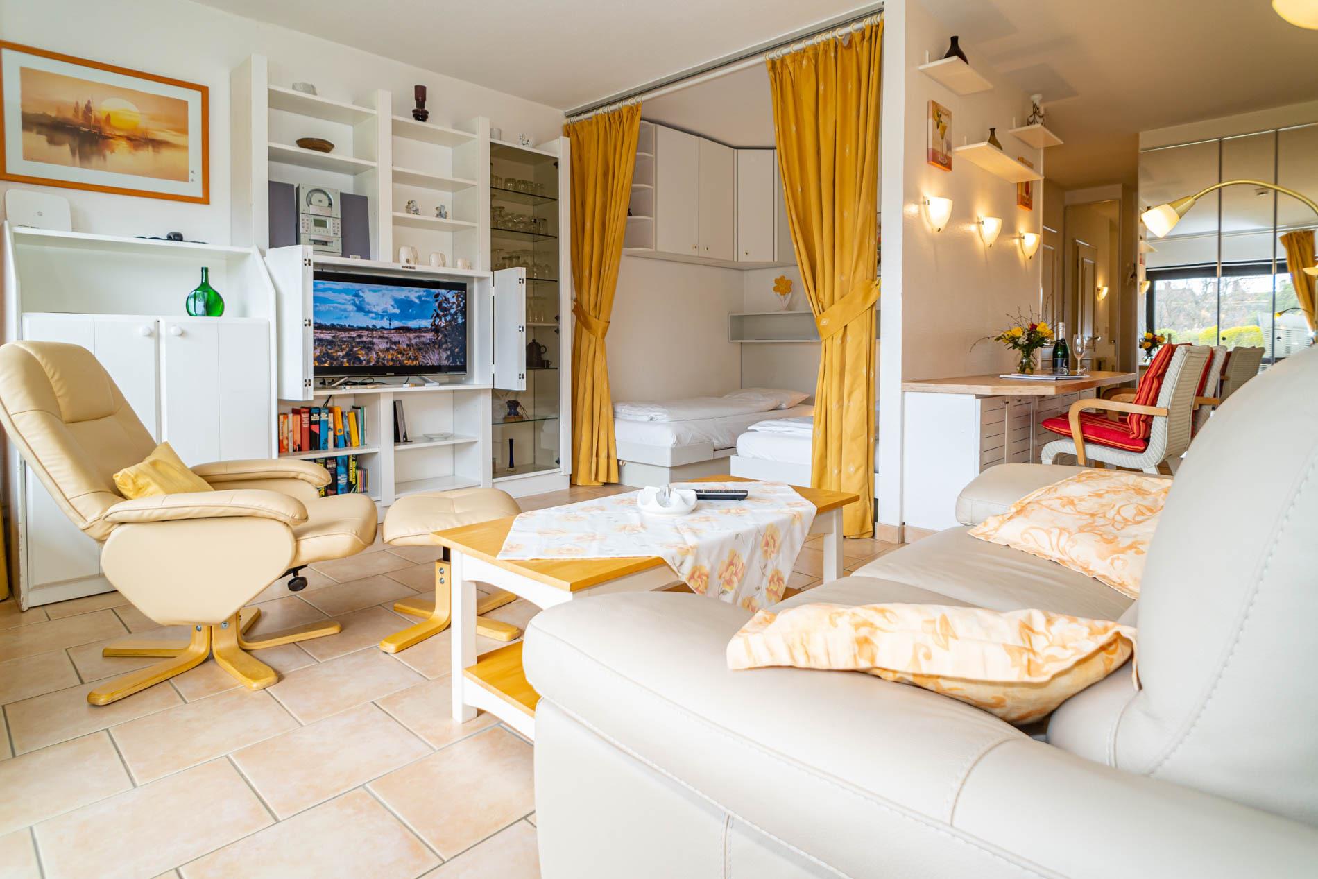 Gemütliche 1,5 Zimmer-Nichtraucher-Ferienwohnung, ca. 40 qm im Parterre zur Südseite mit Südterrasse und Gartenanteil (Strandkorb, Terrassenmöbel mit Auflagen) für max. 2 Personen.