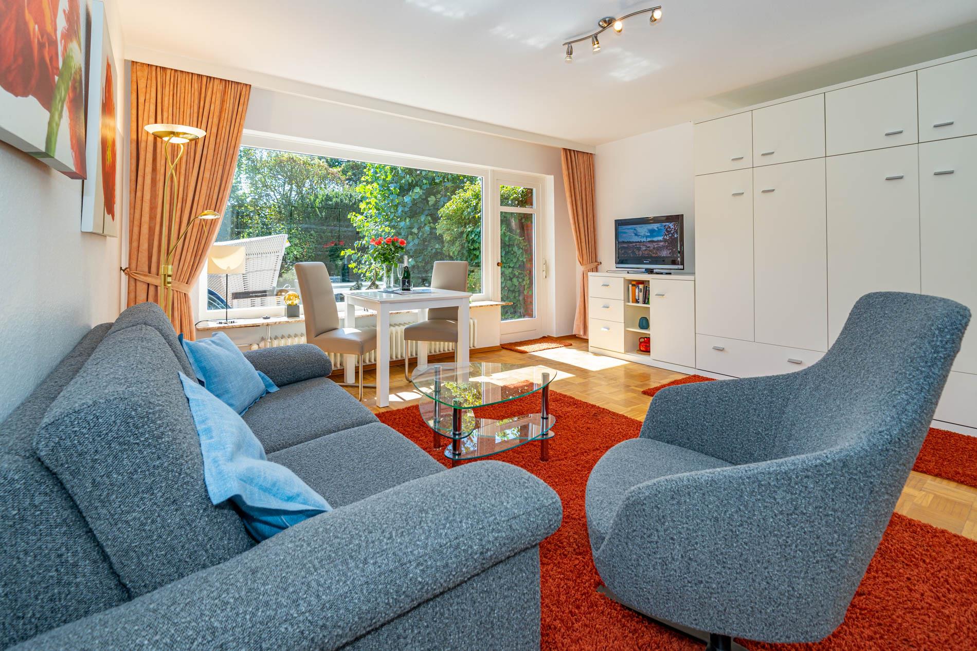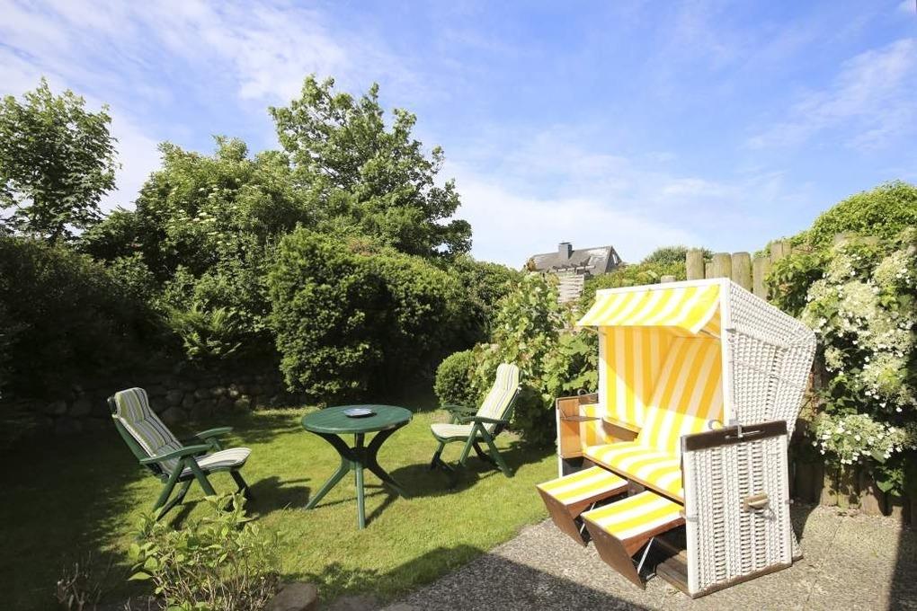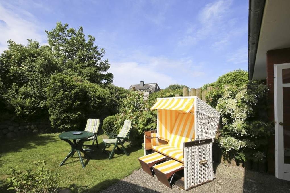 Die nach Süden ausgerichtete Terrasse mit eigenem kleinen Gartenanteil lädt mit Balkonmöbeln, Auflagen und einem Strandkorb zum Sonnenbaden, Frühstücken im Freien oder einfach zum Entspannen ein.