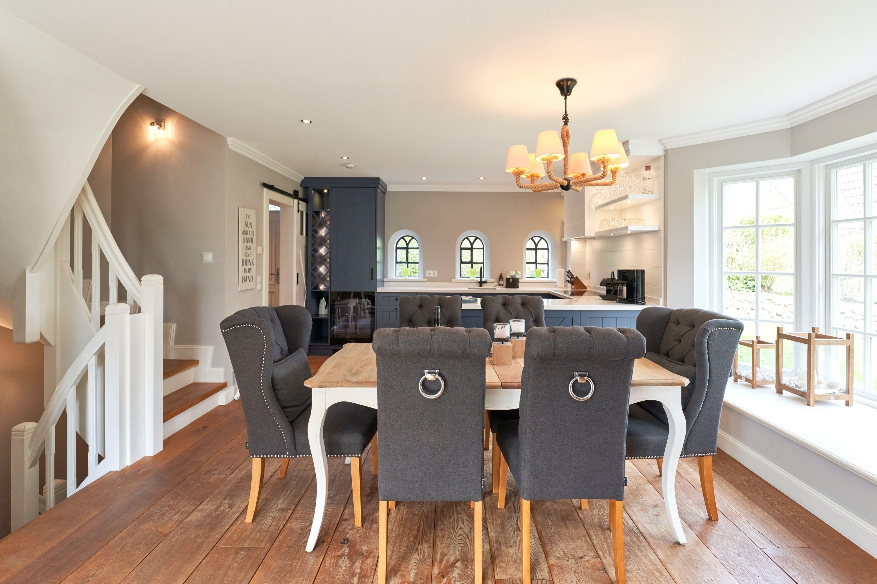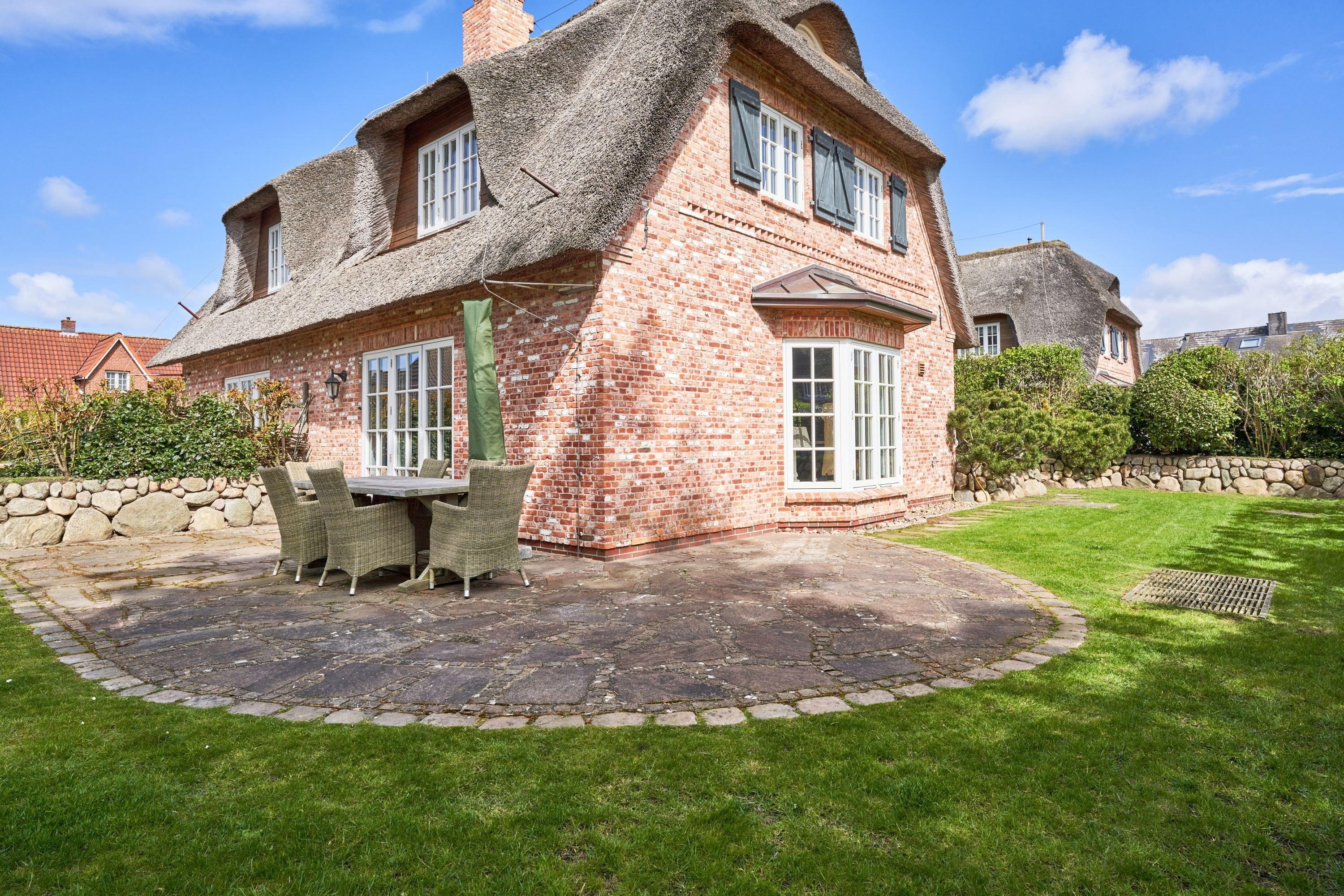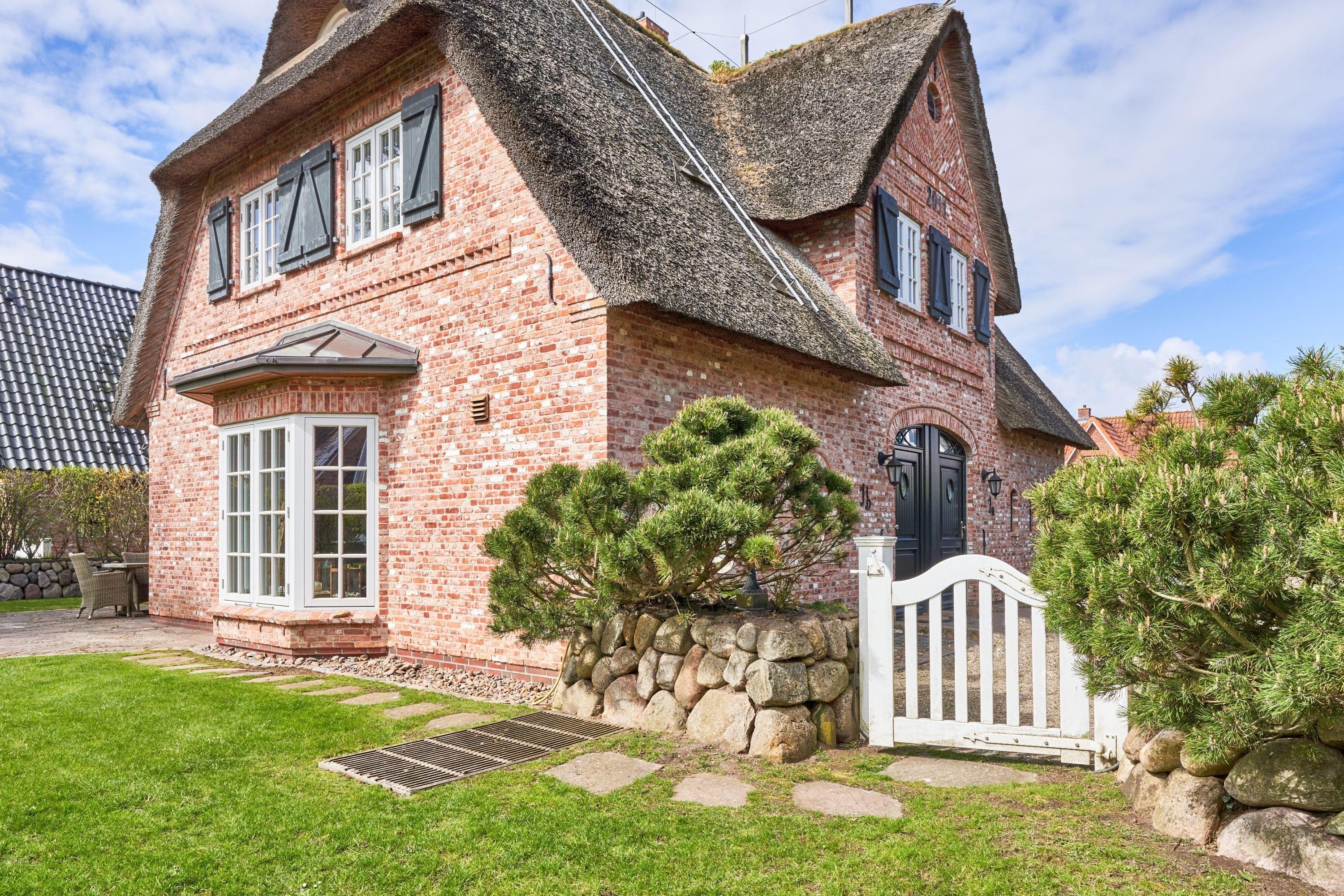 Exklusive Doppelhaushälfte unter Reet im Hampton Style für bis zu 8 Personen. Außen Sylt , innen Hamptons. Über einen kleinen Vorflur mit Garderobe gelangt man in das großzügige Wohnzimmer mit seiner offenen Küche mit den angrenzenden Essplatz für gemütliche Abende. Auffällig und besonders neben der hochwertigen Ausstattung ist das Beleuchtungskonzept sowie die Holzeinbauten mit IPhone - Ladestationen. Im Obergeschoss verfügt über zwei Schlafzimmer und ein Badezimmer mit bodengleicher Dusche. Der ausgebaute Spitzboden verfügt über zwei weitere Einzelbetten. Im Untergeschoss befindet ein Schlafzimmer mit Doppelbett und Schrankeinbauten sowie ein weiteres Wohn und Schlafzimmer. Eine Sauna mit großzügigen Bad ist ebenfalls vorhanden. Der Technik und Hauswirtschafsraum verfügt über eine Waschmaschine und Trockner.