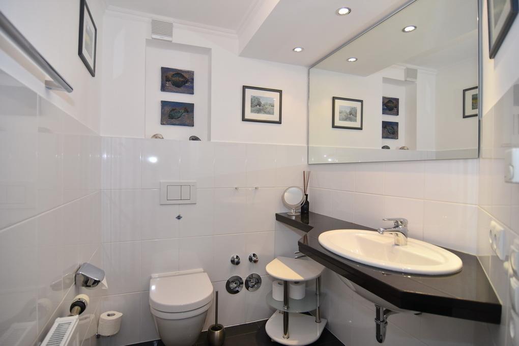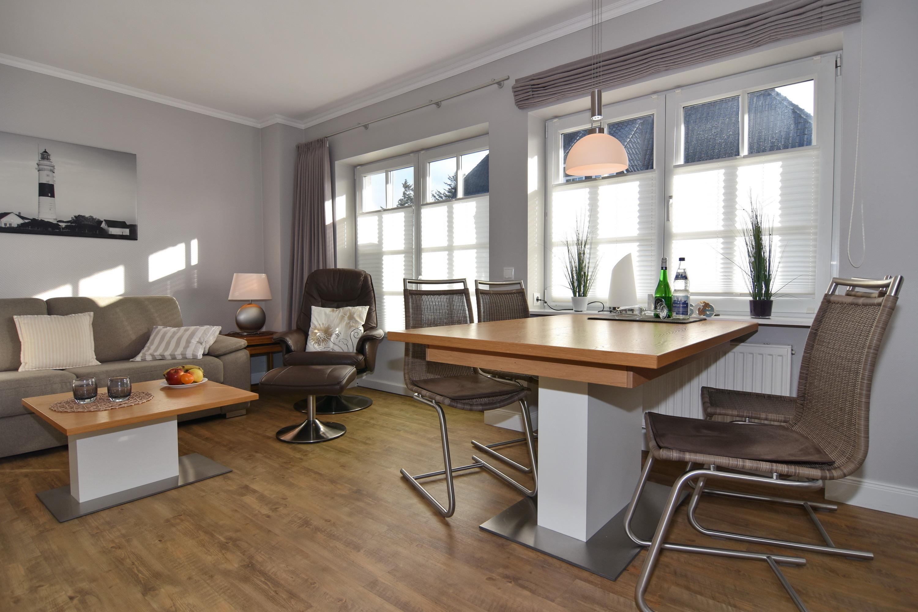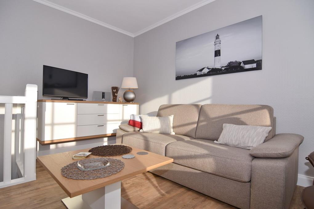 Schicke 2-Zimmer-Ferienwohnung in der Anlage "Witthüs". Ca. 50 m². EG: Wohnzimmer mit Sitz- und Essecke und Zugang zur Ostterrasse, Flat-TV, Radio, Internet, separate Küche mit Ceranherd, Mikrowelle und Geschirrspüler. UG: Schlafzimmer mit Doppelbett (180x200), Einbauschrank und Abseite, neues Duschbad/WC. Im Nebengebäude steht Ihnen eine gemeinschaftliche Sauna zur Verfügung. Zur Wohnung gehört ein Pkw-Aussenstellplatz. In der Gemeinschaftsanlage gibt es eine Waschküche (gegen Gebühr). Bettwäsche und Handtücher sind zur Anreise aufgezogen.
