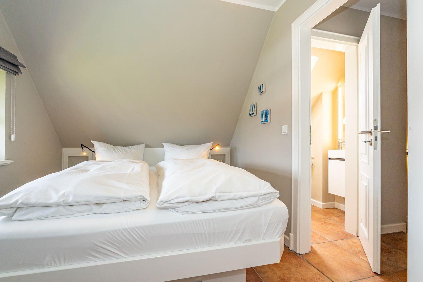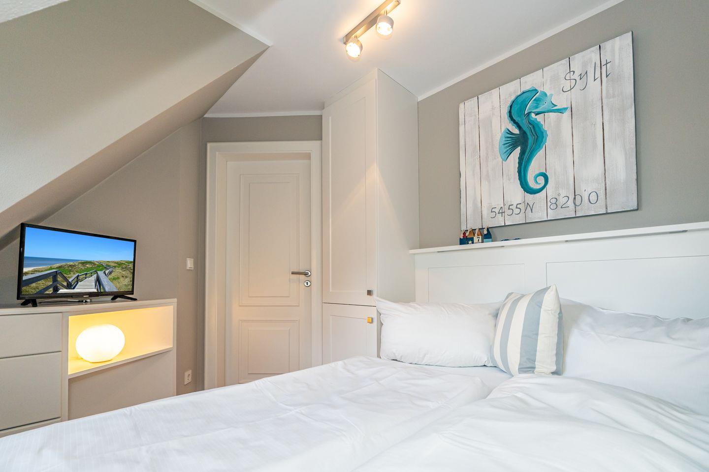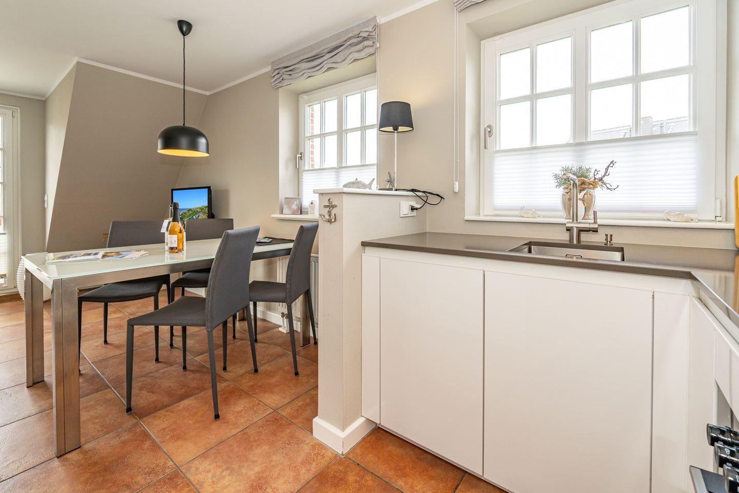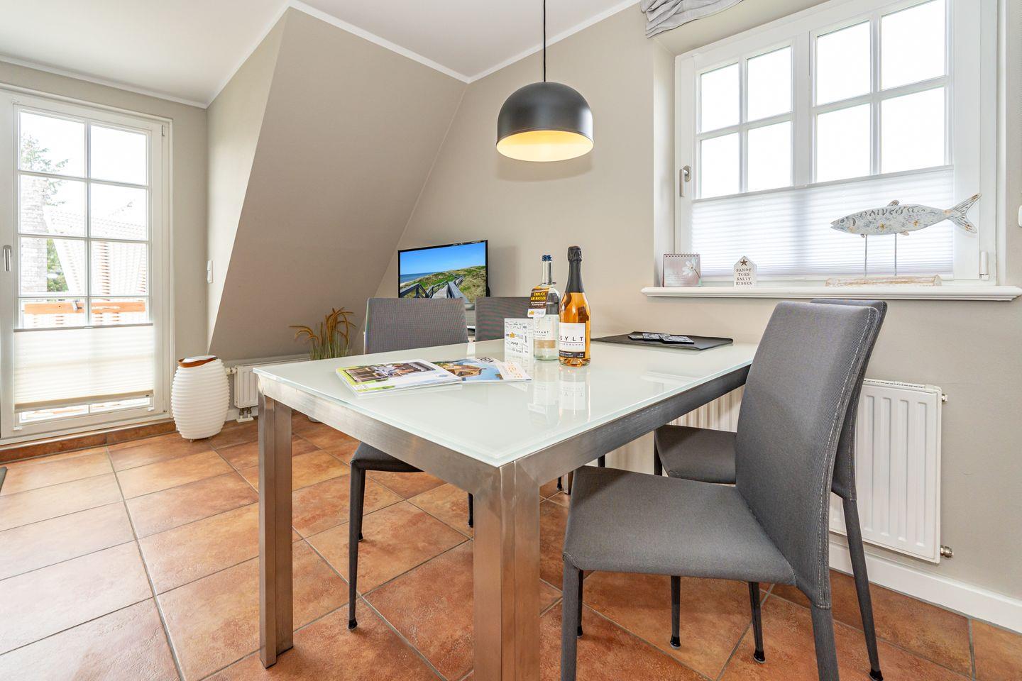Die 3-Zimmer-Ferienwohnung befindet sich im 1.OG und DG. Vom Flur der Ferienwohnung aus erreichen Sie den hellen Wohn- und Essbereich mit gemütlicher Couch, TV und Essplatz. In der angrenzenden offenen Küche stehen Ihnen ein Geschirrspüler, Kühlschrank mit Gefrierfach , Mikrowelle und Kaffeefiltermaschine zur Verfügung. Vom Wohn- und Essbereich haben Sie Zutritt zum Balkon mit Gartenmöbeln und typischen Sylter Strandkorb. Ebenfalls im 1. OG der Ferienwohnung befindet sich eines der beiden Schlafzimmer (Doppelbett 140x200cm) mit TV und das Badezimmer mit Dusche. Über eine Treppe gelangen Sie in das Dachgeschoss mit Schlafzimmer (Doppelbett 180x200cm) und TV. Hier befindet sich auch ein separates Gäste WC mit Toilette. Zur Ferienwohnung gehört ein kostenfreier Stellplatz. WLAN ist selbstverständlich vorhanden. In dieser Ferienwohnung sind leider keine Haustiere erlaubt. Die Ferienwohnung verfügt über einen praktischen Kombi-Waschtrockner.