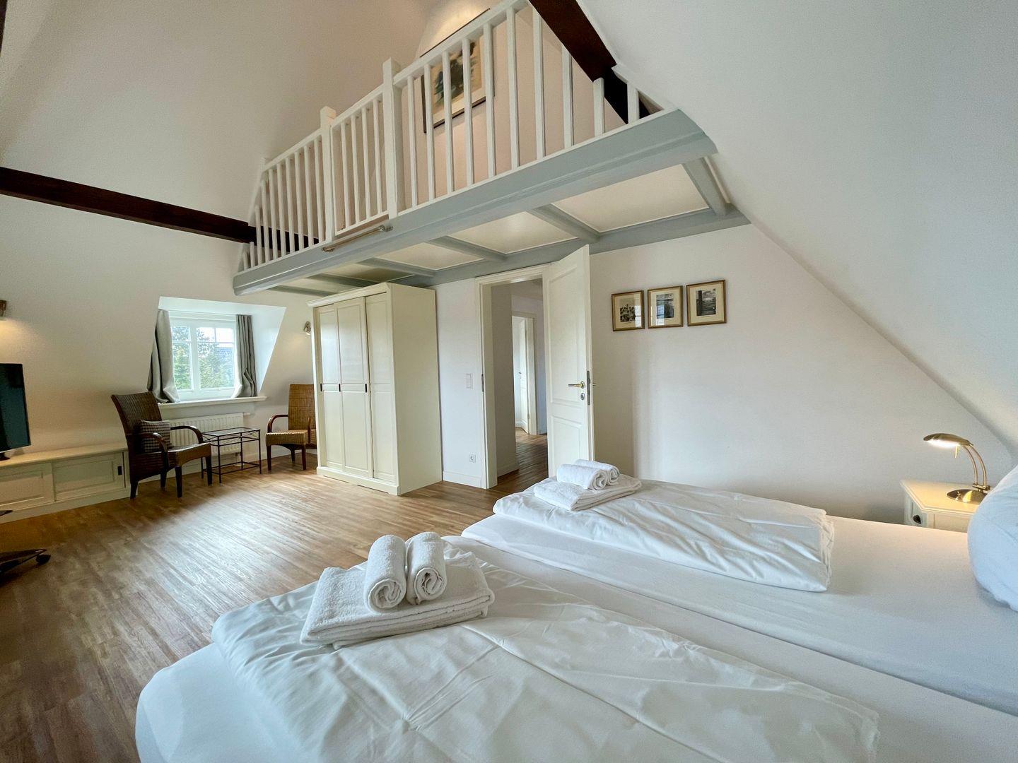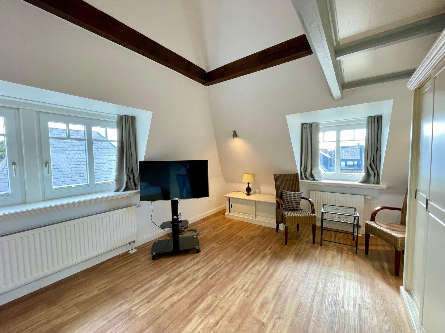 Dieses großzügige Haus präsentiert sich im Landhausstil mit hochwertigen Materialien und warmen Farben. Das sehr große Wohnzimmer mit Parkettfußboden, Esstisch und gemütlicher Sitzgarnitur ist das Herzstück dieses Hauses. Angrenzend befindet sich dann die wind- und sichtgeschützte Terrasse mit eigenem Strandkorb und Gartenmöbeln. Im Erdgeschoss befindet sich ebenfalls die separate Küche, sowie ein Schlafzimmer mit Doppelbett und ein Schlafzimmer mit Einzelbett.