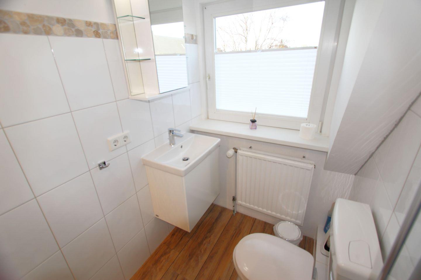 Diese Ferienwohnung verfügt über ein stilvoll eingerichtetes Duschbad mit WC. Geschmackvoll wird der den Füßen schmeichelnde Echtstein-Boden der Dusche in der Bordüre des Fliesenspiegels weitergeführt. Durch das Fenster flutet Tageslicht den Raum und lässt frische Nordseeluft herein.