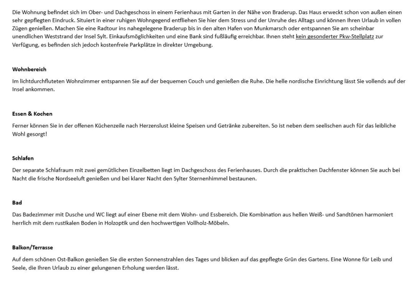 Das von einem idyllisch angelegten Garten umgebene Ferienhaus in der Nähe von Braderup erweckt schon von außen einen sehr gepflegten Eindruck. Situiert in einer ruhigen Wohngegend entfliehen Sie hier dem Stress und der Unruhe des Alltags und können Ihren Urlaub in vollen Zügen genießen. Machen Sie eine Radtour ins nahegelegene Braderup bis in den alten Hafen von Munkmarsch oder entspannen Sie am scheinbar unendlichen Weststrand der Insel Sylt. Einkaufsmöglichkeiten und eine Bank sind fußläufig erreichbar. Ihnen steht kein gesonderter Pkw-Stellplatz zur Verfügung, es befinden sich jedoch kostenfreie Parkplätze in direkter Umgebung.