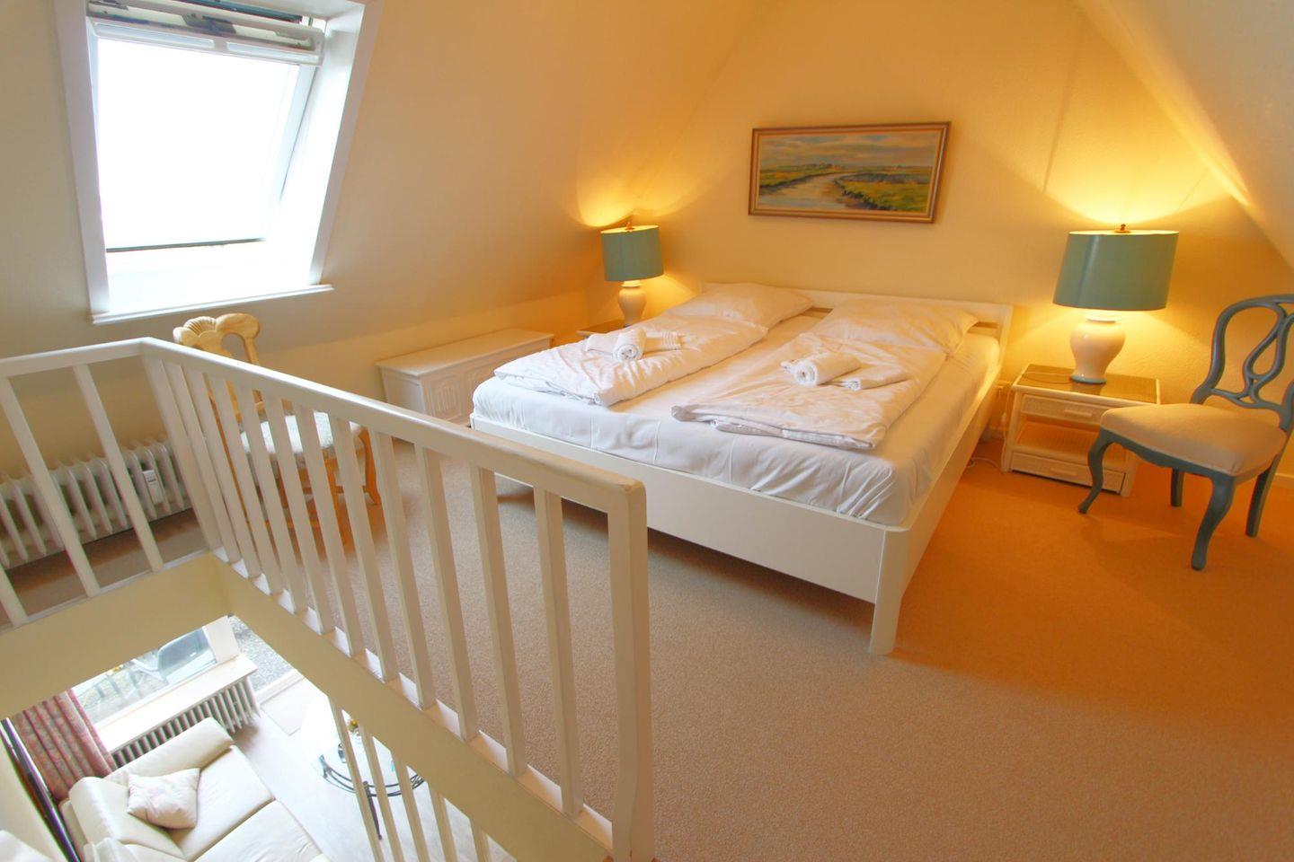 Im Obergeschoss auf der Wohnebene befindet sich ein Schlafraum mit zwei Einzelbetten. Darüber hinaus finden Sie im Dachgeschoss einen Doppelschlafraum, in dem Sie ruhig träumen können.