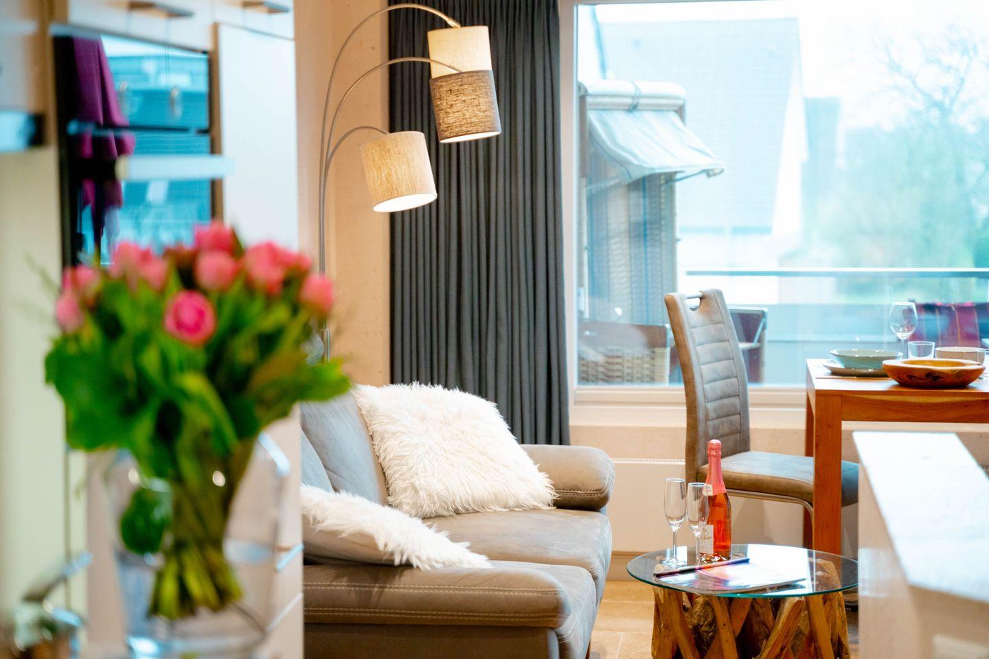 Einbauschränke, Esstisch, Flat-TV, Digitalradio, Verdunkelungsvorhänge und Sichtschutzplissees runden die liebevolle Einrichtung der Appartements ab.