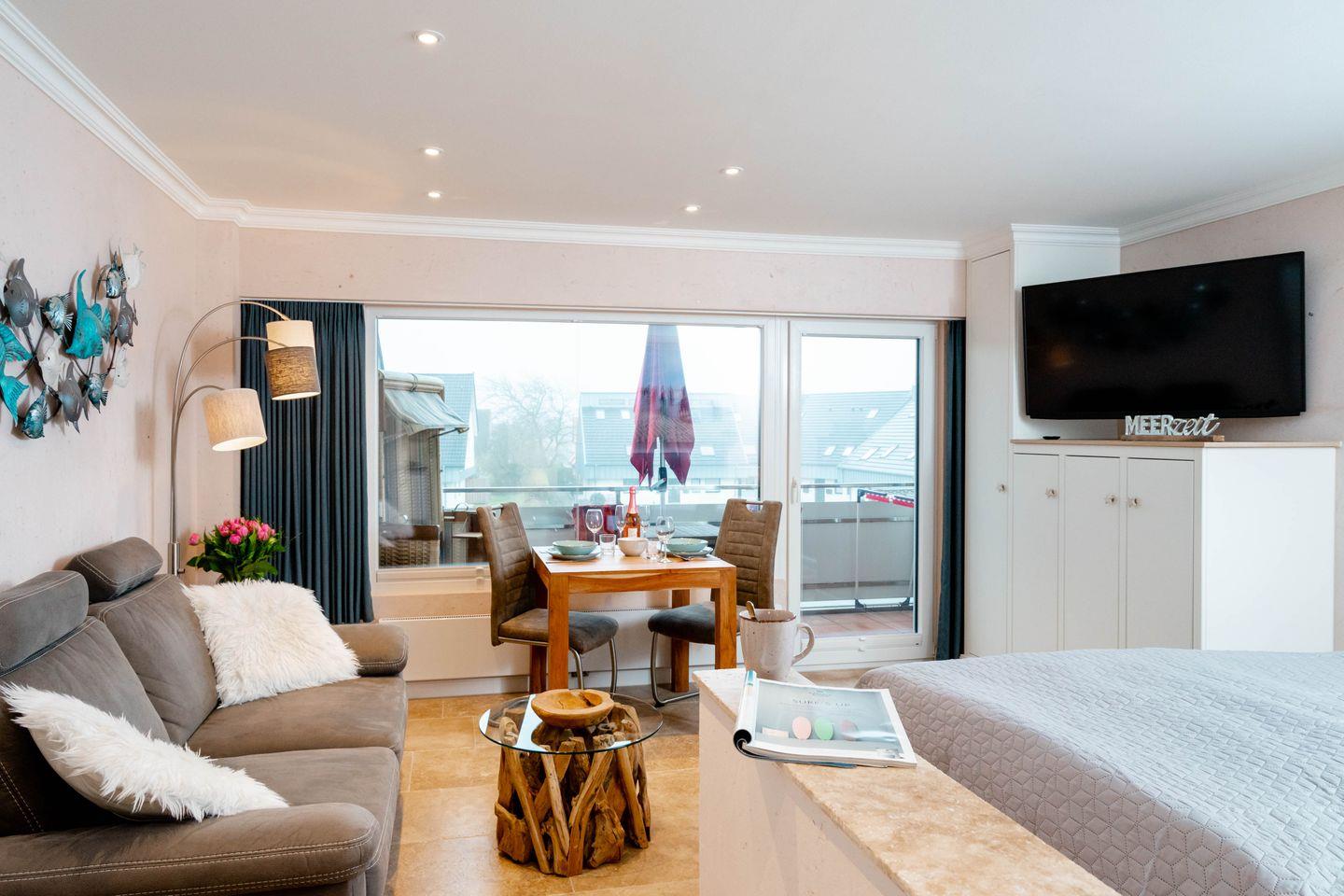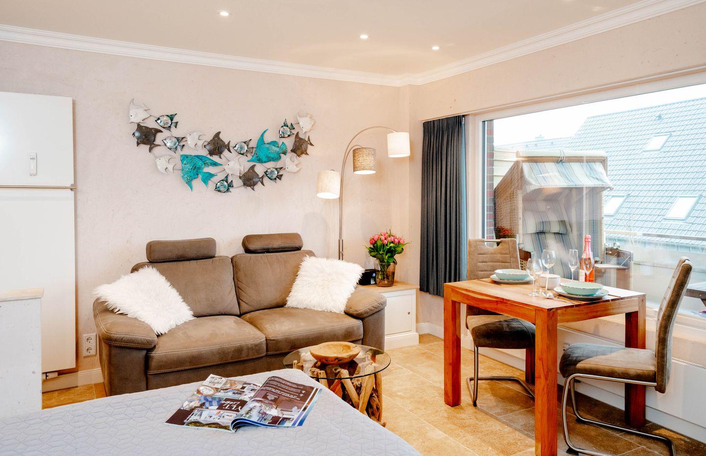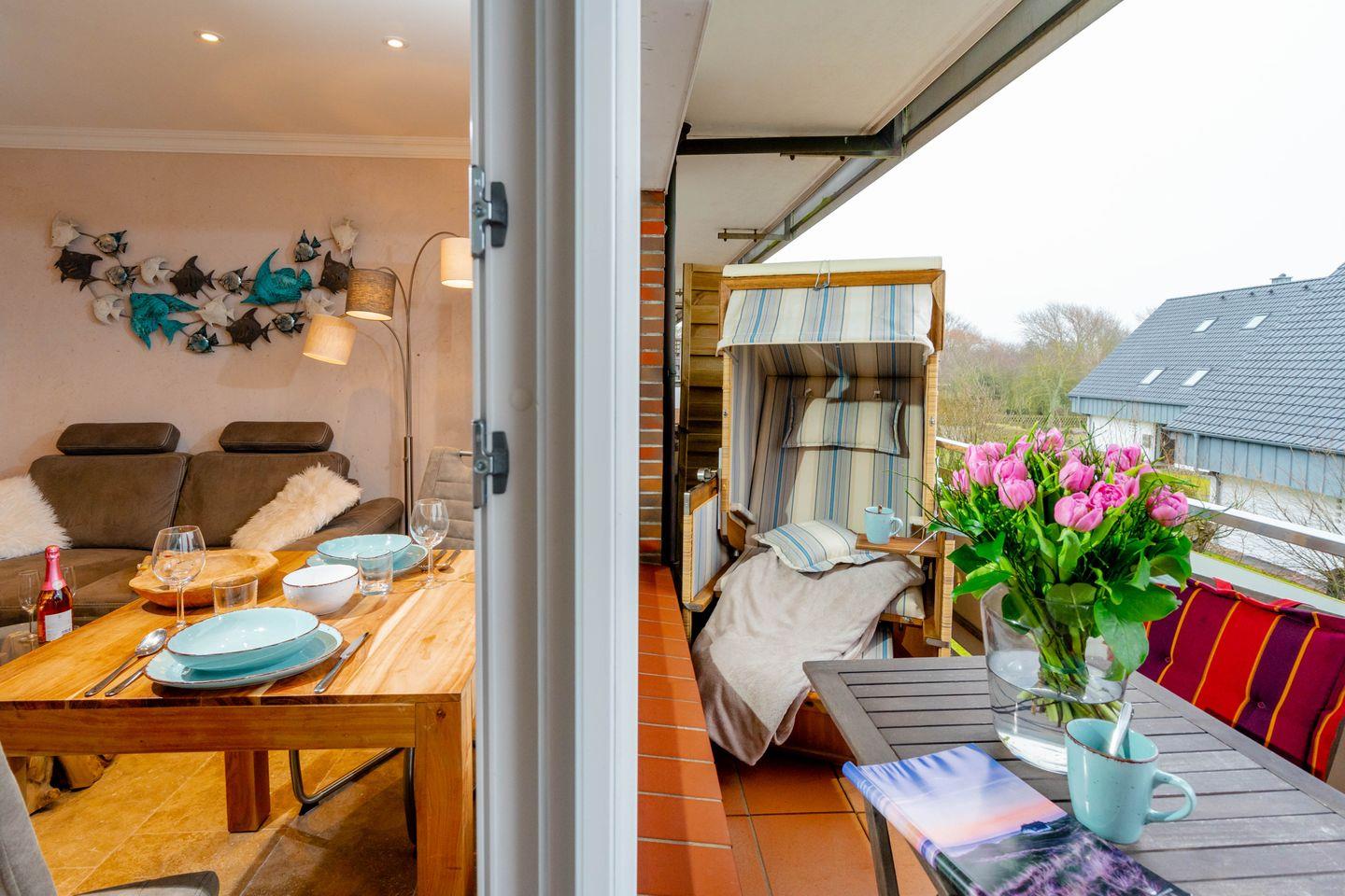 Für einen gemütlichen Tagesausklang laden die Südbalkone mit einem kleinen Strandkorb, einem Tisch mit zwei Stühlen aus Holz sowie ein Sonnenschirm ein.