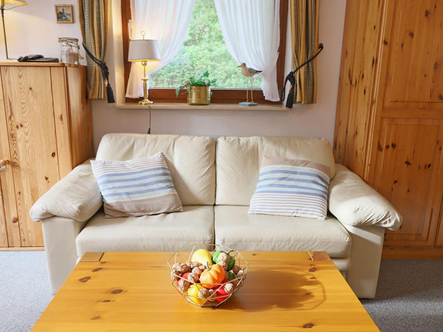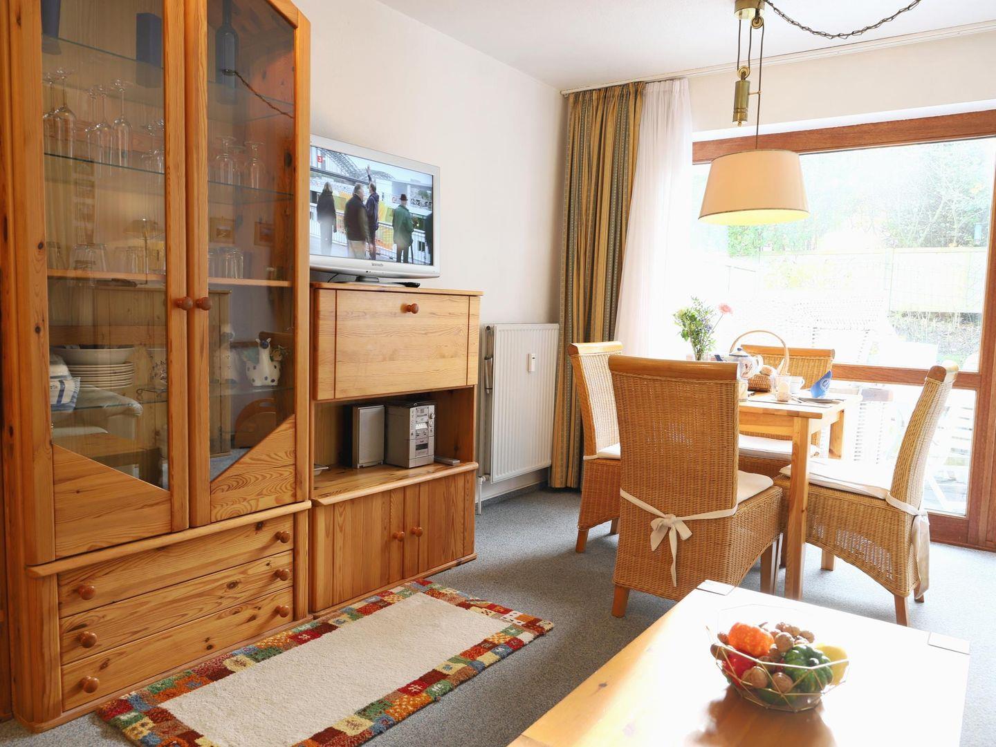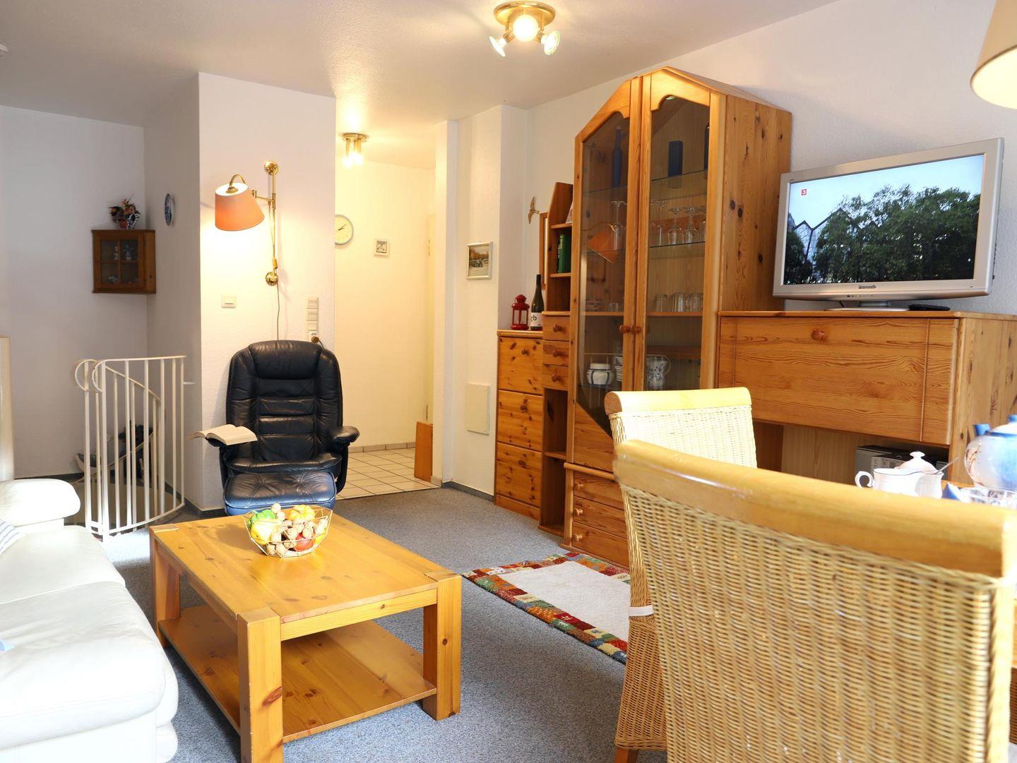 Dieses ca. Das 50 m² große Appartement erstreckt sich über zwei Etagen und befindet sich in ruhiger Lage am Ortseingang von Wenningstedt. Im Erdgeschoss finden Sie ein Wohnzimmer mit Schlafcouch (140 x 200 cm), Essecke und Kabel-TV sowie eine offene Küche mit 2-Platten-Kochfeld und Mikrowelle. Über eine Wendeltreppe gelangen Sie ins Untergeschoss, wo sich das Schlafzimmer mit Doppelbett (180 x 200 cm) und das Badezimmer mit Dusche und WC befinden. Die eigene Süd-Terrasse ist mit einem Strandkorb (April-Oktober) sowie einem Gartentisch und Stühlen ausgestattet. Ein kostenfreier Stellplatz und Münz-Waschmöglichkeiten (Waschmaschine und Trockner) im Haus sind ebenfalls vorhanden. Haustiere sind erlaubt.