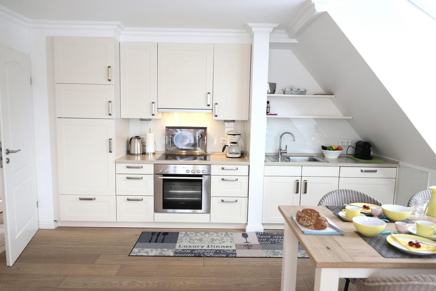 Genießen Sie Ihren Urlaub auf hohem Niveau in dieser luxuriösen 80 m² großen Ferienwohnung in Wenningstedt. Die hochwertige Möblierung und geschmackvolle Einrichtung bieten Ihnen ein besonderes Sylterlebnis. Das Dachgeschoss erwartet Sie mit einem stilvoll eingerichteten Wohnraum, der mit einem Flatscreen-Kabel-TV ausgestattet ist. Die integrierte Küche verfügt über einen Geschirrspüler, Backofen und alles, was Sie zur Zubereitung Ihrer Mahlzeiten benötigen. Das elegante Badezimmer ist mit WC und Dusche ausgestattet. Vom Wohnzimmer aus gelangen Sie auf den sonnigen Süd-Balkon, der mit Gartenmöbeln ausgestattet ist – perfekt, um den Tag zu genießen. Über eine Treppe erreichen Sie das Schlafzimmer mit einem komfortablen Doppelbett (180 x 200 cm). Ein kostenfreier Stellplatz ist am Haus vorhanden. Haustiere sind willkommen. Im Haus finden Sie auch einen Waschtrockner, der für zusätzlichen Komfort sorgt.