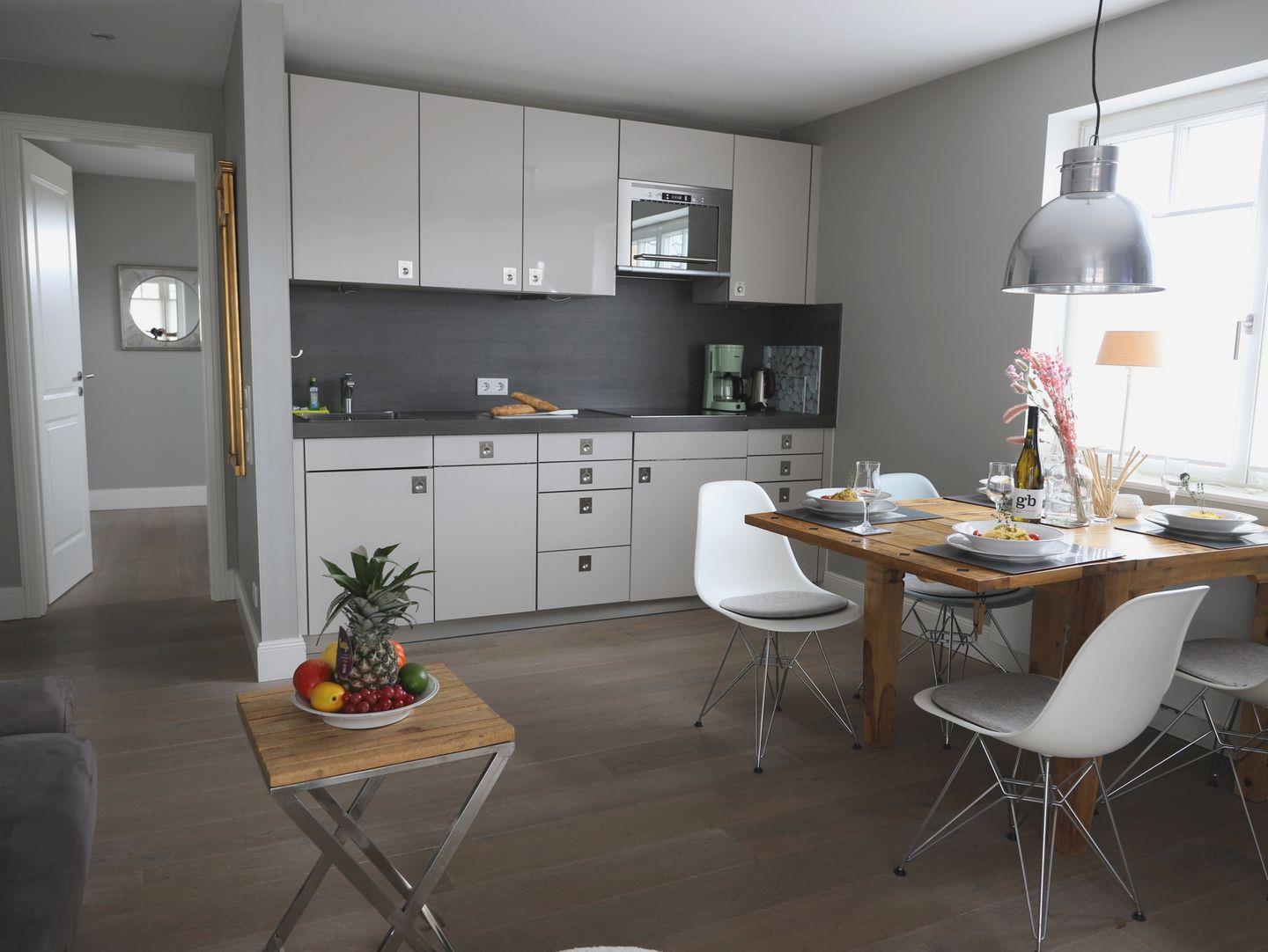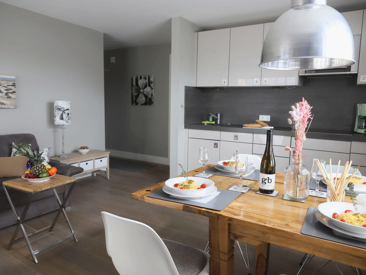 Diese stilvoll eingerichtete 2-Zimmer-Wohnung in Wenningstedt auf Sylt bietet auf ca. 50 m² Platz für bis zu vier Personen. Die Ferienwohnung besticht durch edles Design und ein exklusives Ambiente. Das helle Wohnzimmer verfügt über ein komfortables Schlafsofa (160x200 cm) und bietet Zugang zu einem möblierten Süd-Balkon. Das Schlafzimmer ist mit einem Doppelbett (180x200 cm) ausgestattet und bietet vollständige Verdunkelungsmöglichkeiten für einen erholsamen Schlaf. Das moderne Badezimmer rundet den Komfort ab. Im Keller stehen Münz-Waschmaschine und Trockner zur Verfügung. Ein kostenfreier Parkplatz befindet sich direkt vor dem Haus. Haustiere sind nicht gestattet.
