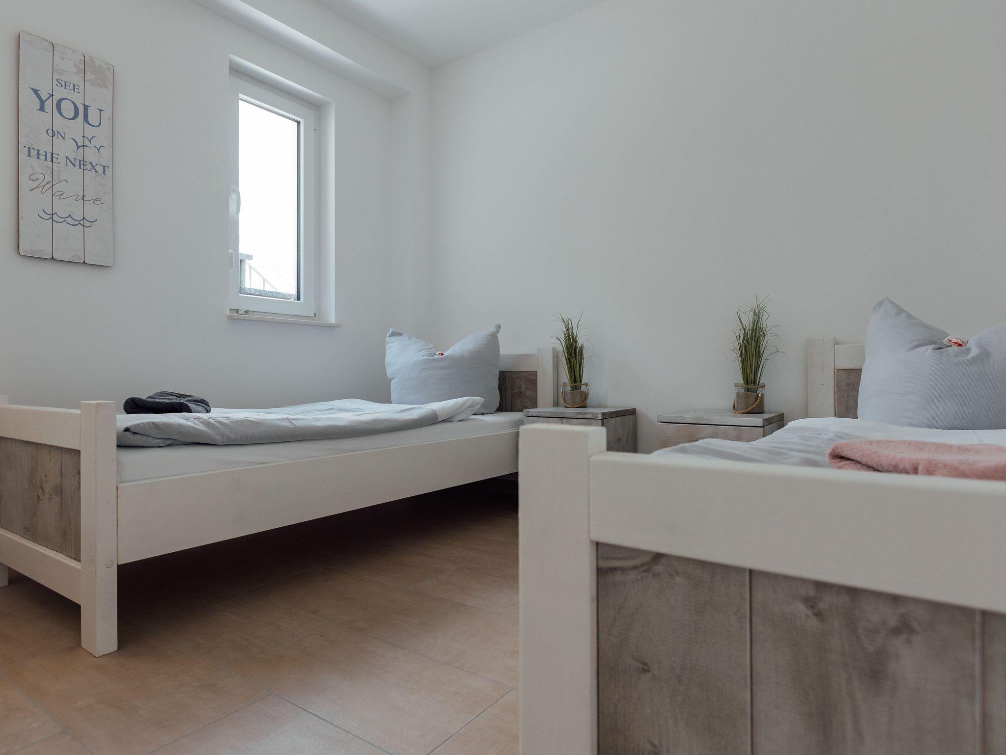 Die Ferienwohnung Havelbucht bietet Platz für bis zu vier Personen. Sie ist auf zwei Etagen aufgeteilt. Im Erdgeschoss gibt es einen offenen Wohn- und Küchenbereich mit Essplatz und Zugang zur Terrasse. In der oberen Etage befinden sich ein Schlafzimmer mit Doppelbett, ein Schlafzimmer mit zwei EInzelbetten und ein Badezimmer mit Dusche und WC. Alle Einzelbetten haben jeweils eine Größe von 80x200 cm.