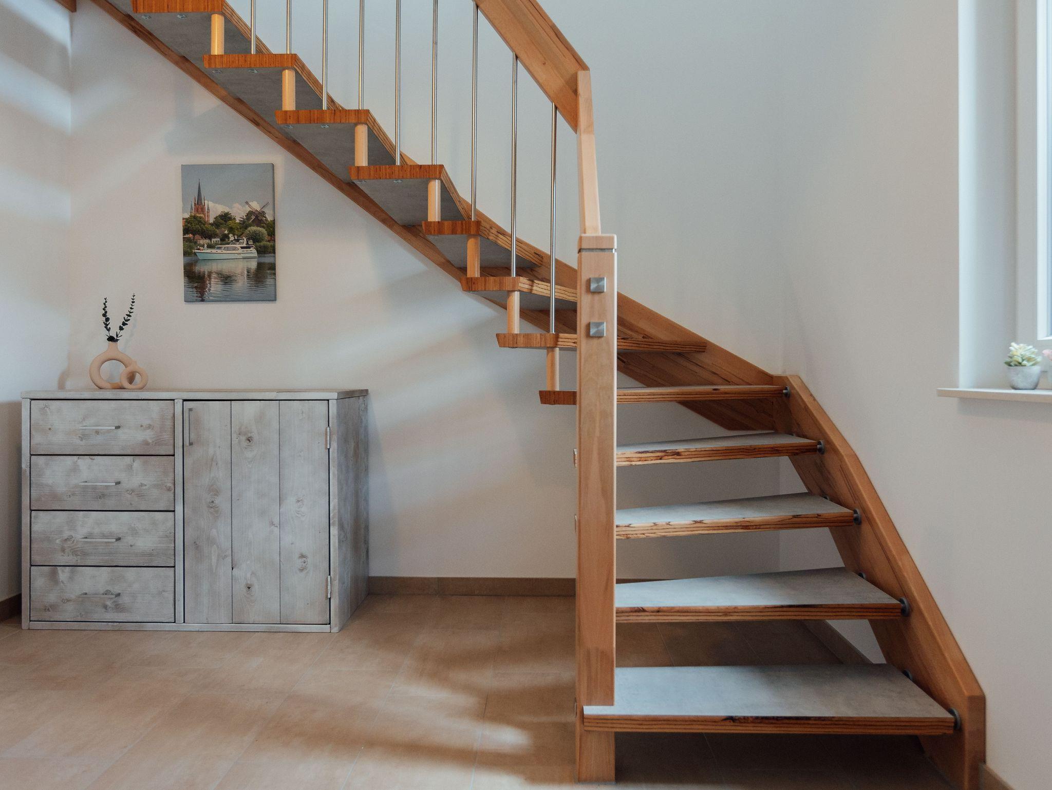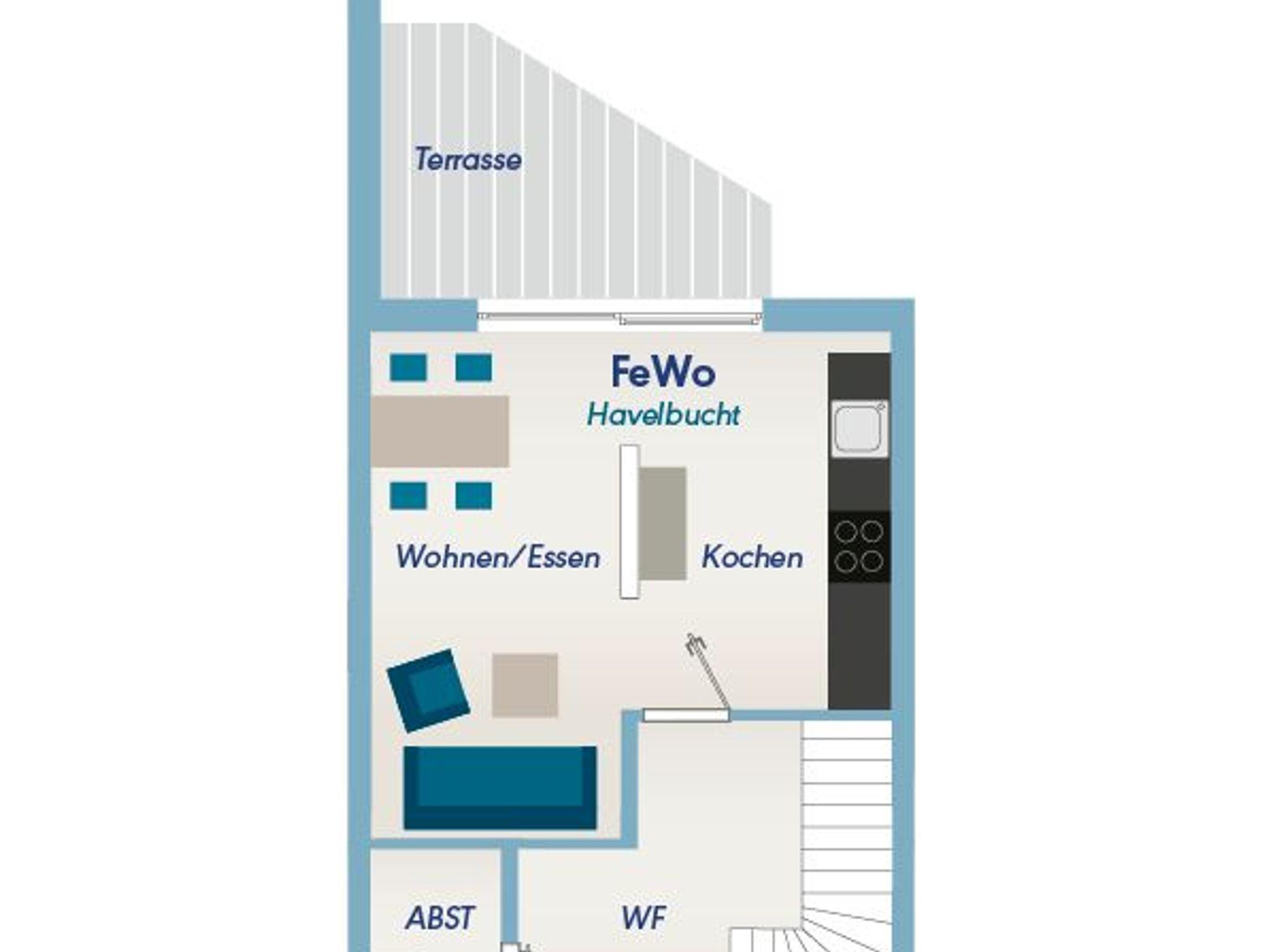 Die Ferienwohnung Havelbucht bietet Platz für bis zu vier Personen. Sie ist auf zwei Etagen aufgeteilt. Im Erdgeschoss gibt es einen offenen Wohn- und Küchenbereich mit Essplatz und Zugang zur Terrasse. In der oberen Etage befinden sich ein Schlafzimmer mit Doppelbett, ein Schlafzimmer mit zwei Einzelbetten und ein Badezimmer mit Dusche und WC. Alle Einzelbetten haben jeweils eine Größe von 80x200 cm.