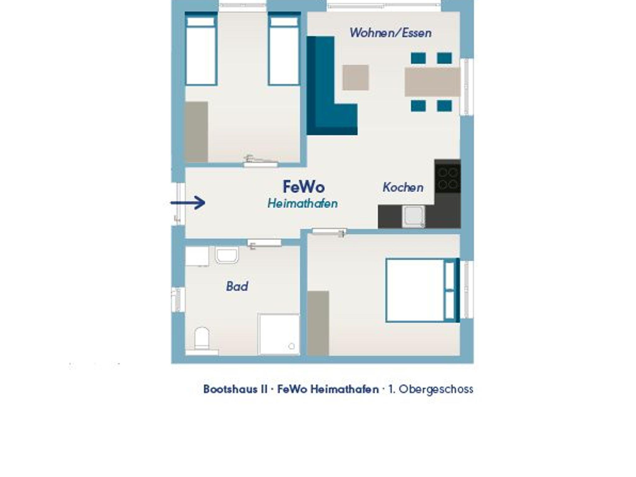 Die Ferienwohung Heimathafen bietet Platz für bis zu 4 Personen. Neben einem offenen Wohn- und Küchenbereich mit Essplatz und moderner Küchenzeile, gibt es zwei separate Schlafzimmer. Die Schlafzimmer sind einmal mit einem Doppelbett und einmal mit zwei Einzelbetten eingerichtet. Das Badezimmer ist mit Dusche und WC ausgestattet. Zur Ferienwohnung gehört ein Balkon. Alle Einzelbetten haben jeweils eine Größe von 80x200 cm.