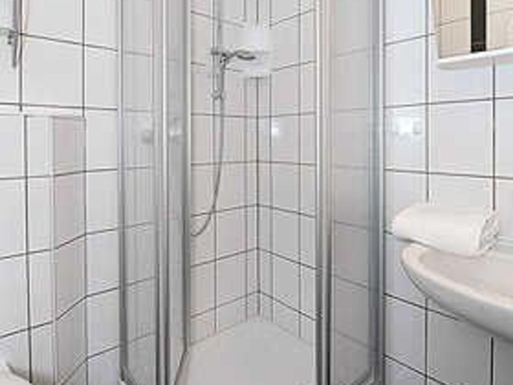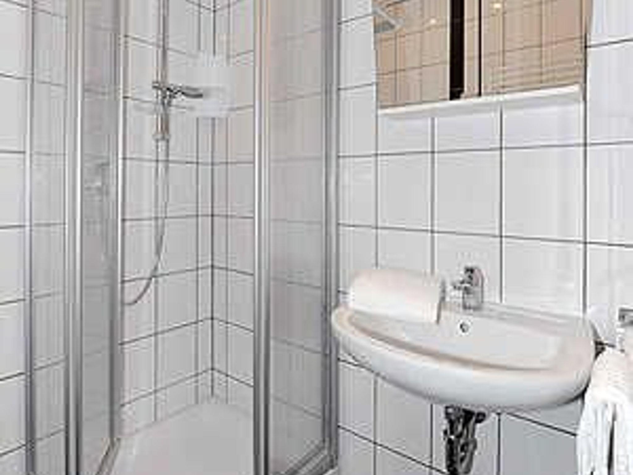 Badezimmer mit Dusche, Waschtisch und WC