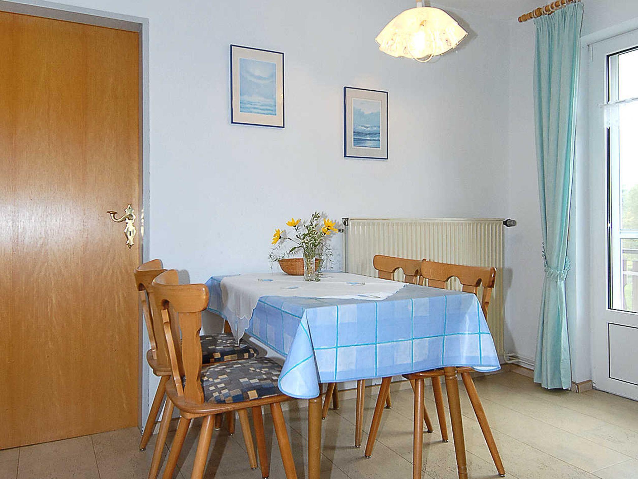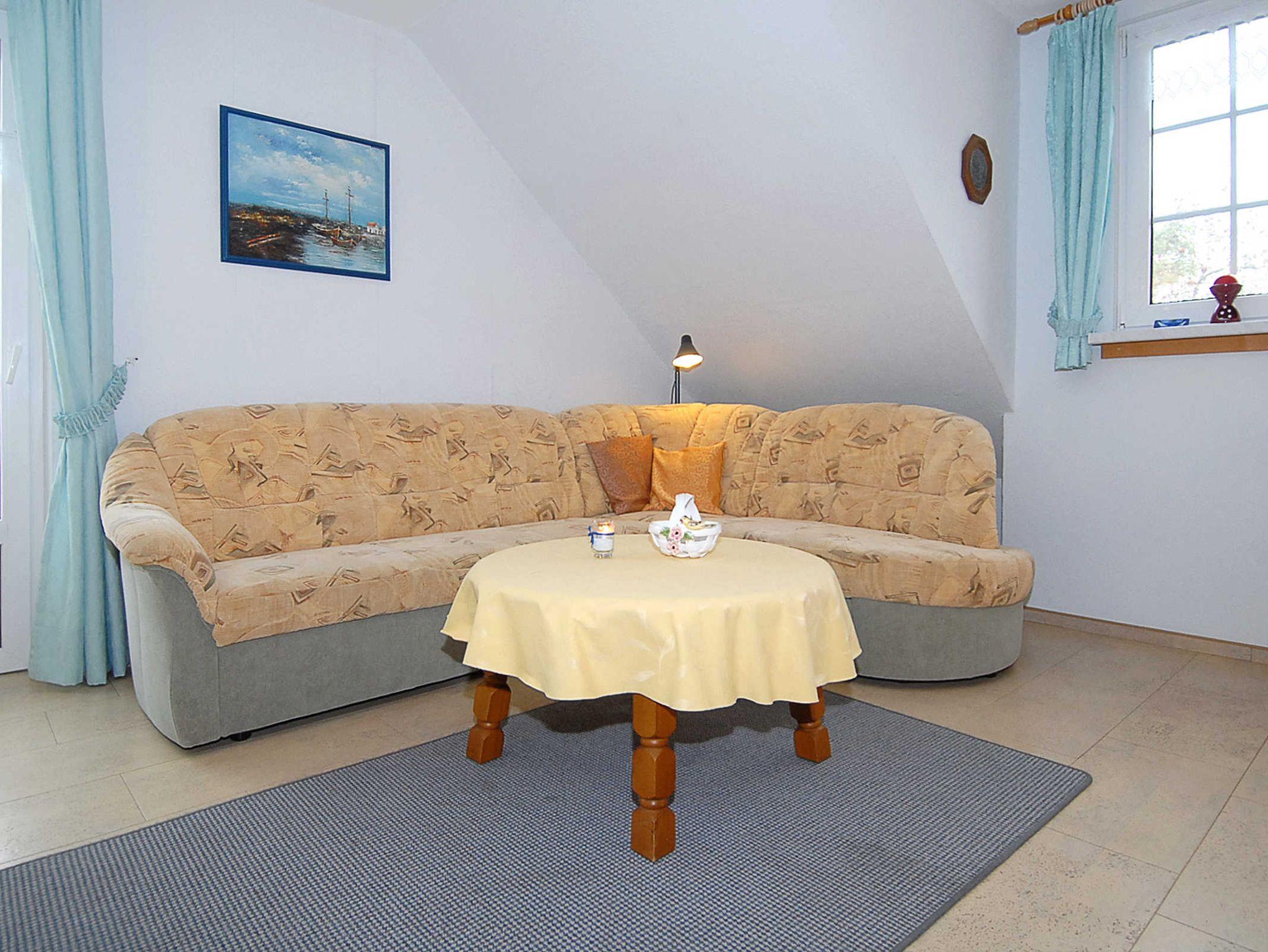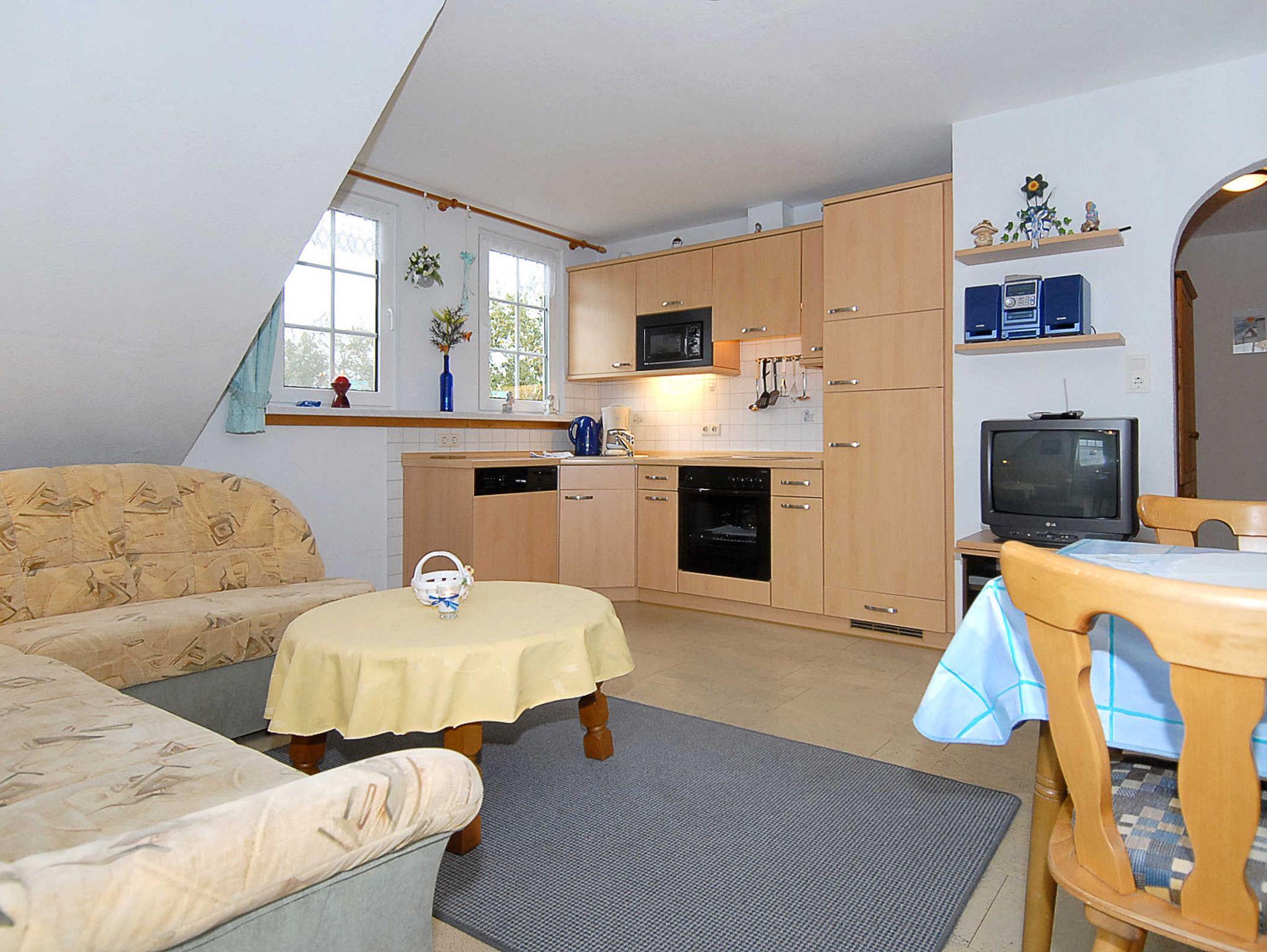 Größe ca. 70 Quadratmeter, Wohnraum mit integrierter Küche, Schlafzimmer, zweites separates Schlafzimmer/Kinderzimmer, Badezimmer mit Dusche, Waschtisch und WC, Obergeschoss, Balkon, optimal für 2 bis 4 Personen.