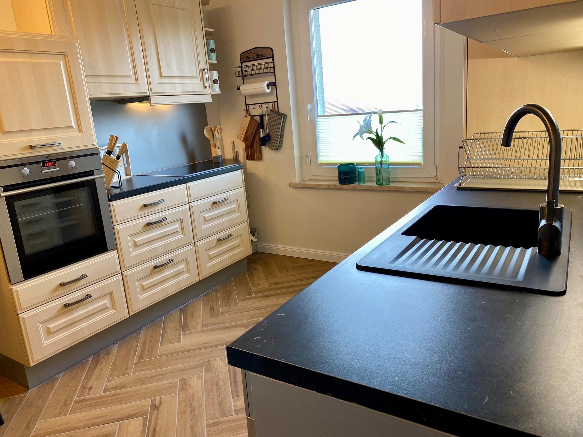 Die hochwertig ausgestattete Küche mit Backofen, Cerankochfeld, Spülmaschine, Kühlschrank, Kaffeemaschine, Toaster und vielem mehr lädt zum gemeinsamen Kochen ein. Im angrenzenden Esszimmer finden an einem großen Tisch bis zu 6 Personen Platz – ideal für gesellige Runden.