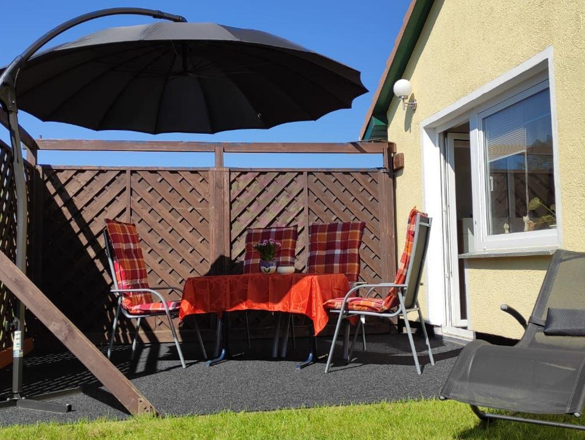 Unterkunft: Das 3-Raum-Ferienhaus mit Gartenterrasse ist ca. 63 m² gross und verfügt über ein Wohnzimmer mit Eckcouch, 1 Schlafzimmer mit Doppelbett (1,40x2m) und 1 Schlafzimmer mit Schlafcouch (1,40x2m) und bietet Platz für 3 Erwachsene.