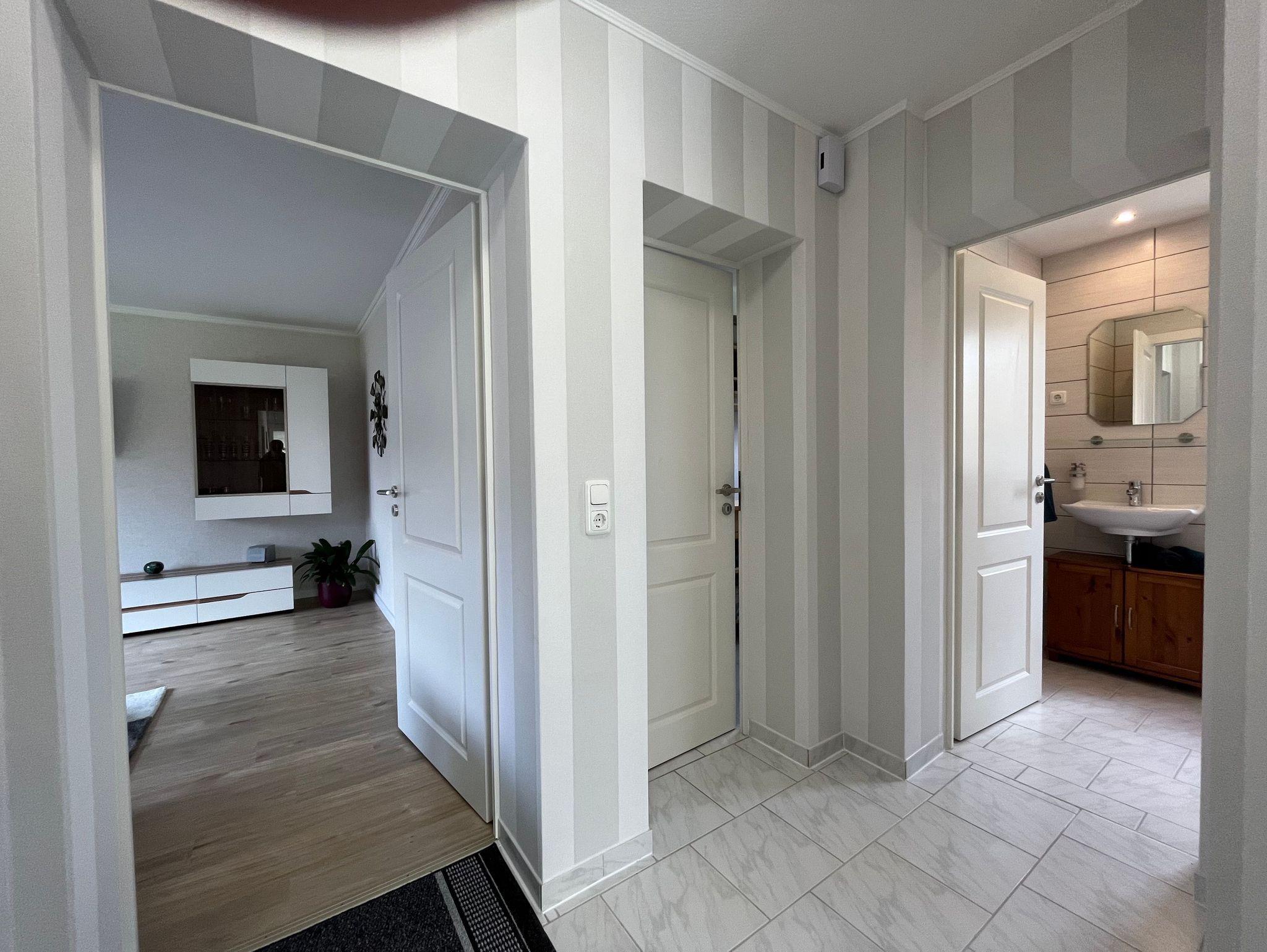 Barrierefrei: Ebenerdig außer 1 Eingangsstufe ins Haus und Badewanne. Durchgangsbreite Küchentür 70cm. Laminat- und Fliesenböden.