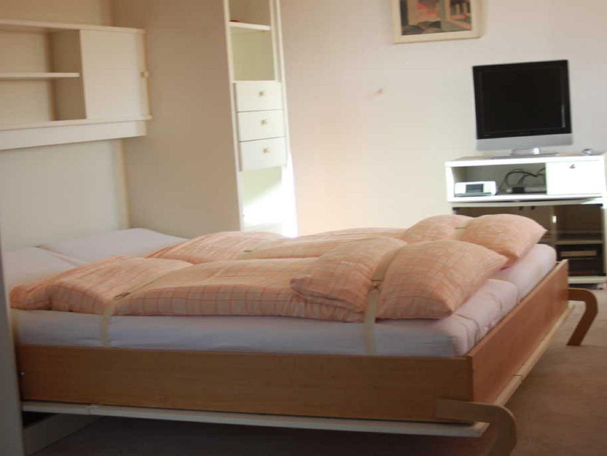 Appartement im Obergeschoss für 2 Personen. Geräumiges Wohn-Esszimmer mit Doppel-Schrankbett, Essecke, Sitzgarnitur, Flachbild TV. Separate Küche mit 2 Plattenkochherd, Kühlschrank mit Gefrierfach, Mikrowelle, Kaffeemaschine, Toaster, Wasserkocher, Geschirr und Töpfe. Badezimmer mit Dusche, WC, Waschbecken, Handtuchtrockner und Fön.