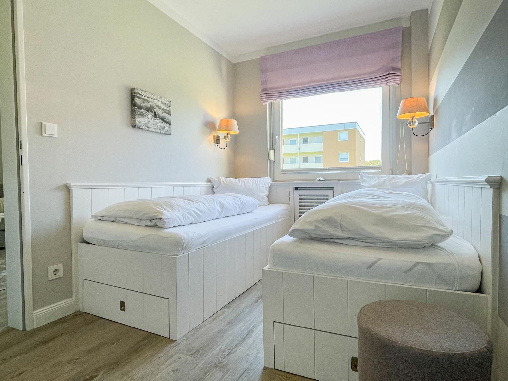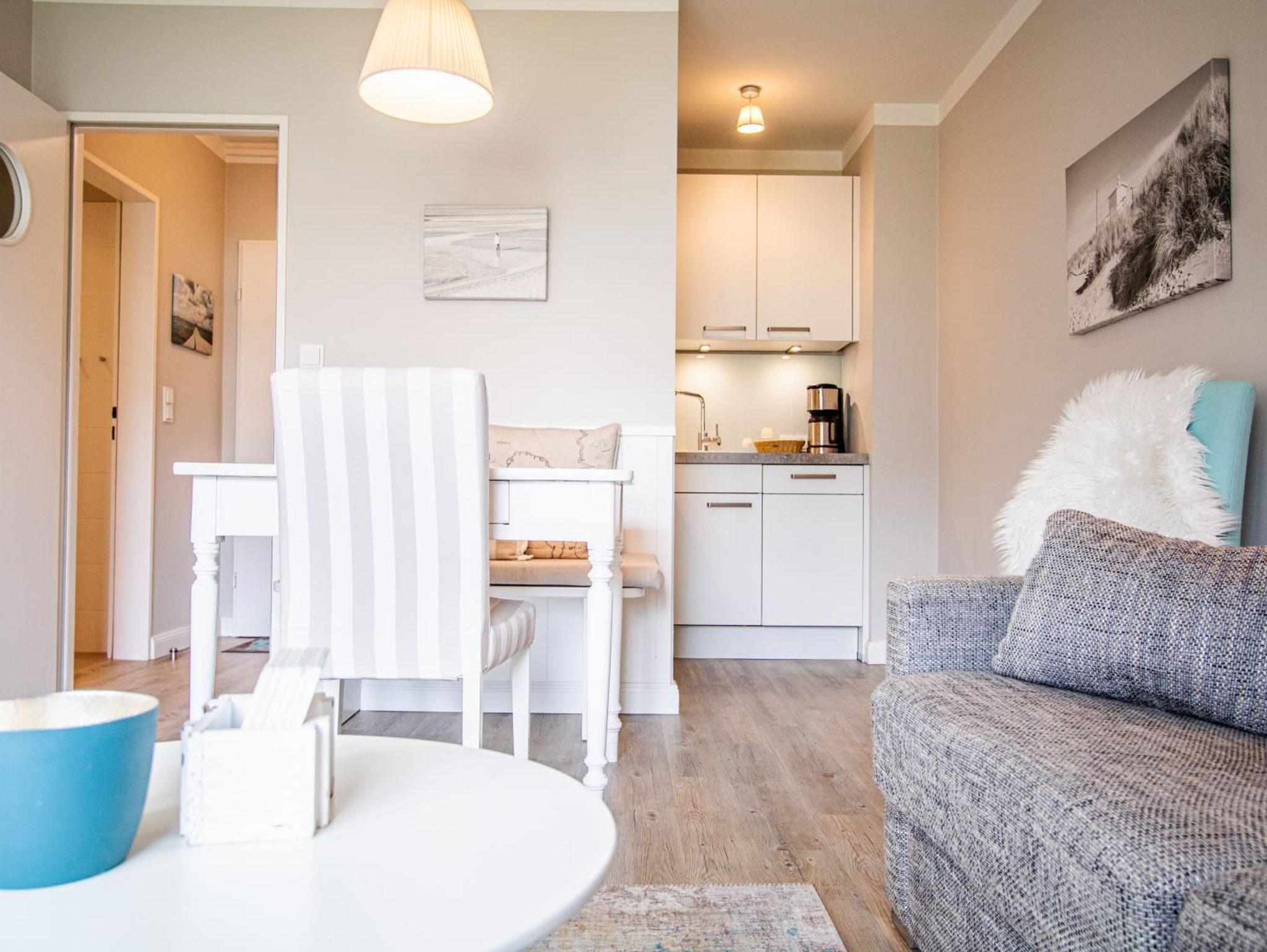 Hochwertig und geschmackvoll eingerichtetes 2-Zimmer-Appartement im Süden von Westerland in sehr ruhiger Lage. Im separaten Schlafzimmer befinden sich 2 Einzelbetten und ein großer, geräumiger Einbauschrank. Im Wohnzimmer ist ein Schlafsofa und der Zugang zum Westbalkon. Das Besondere im Wohnzimmer ist ein elektrischer Kamin. Die offene Küche ist komplett ausgestattet mit u. a. Spülmaschine und Mikrowelle mit Backfunktion.