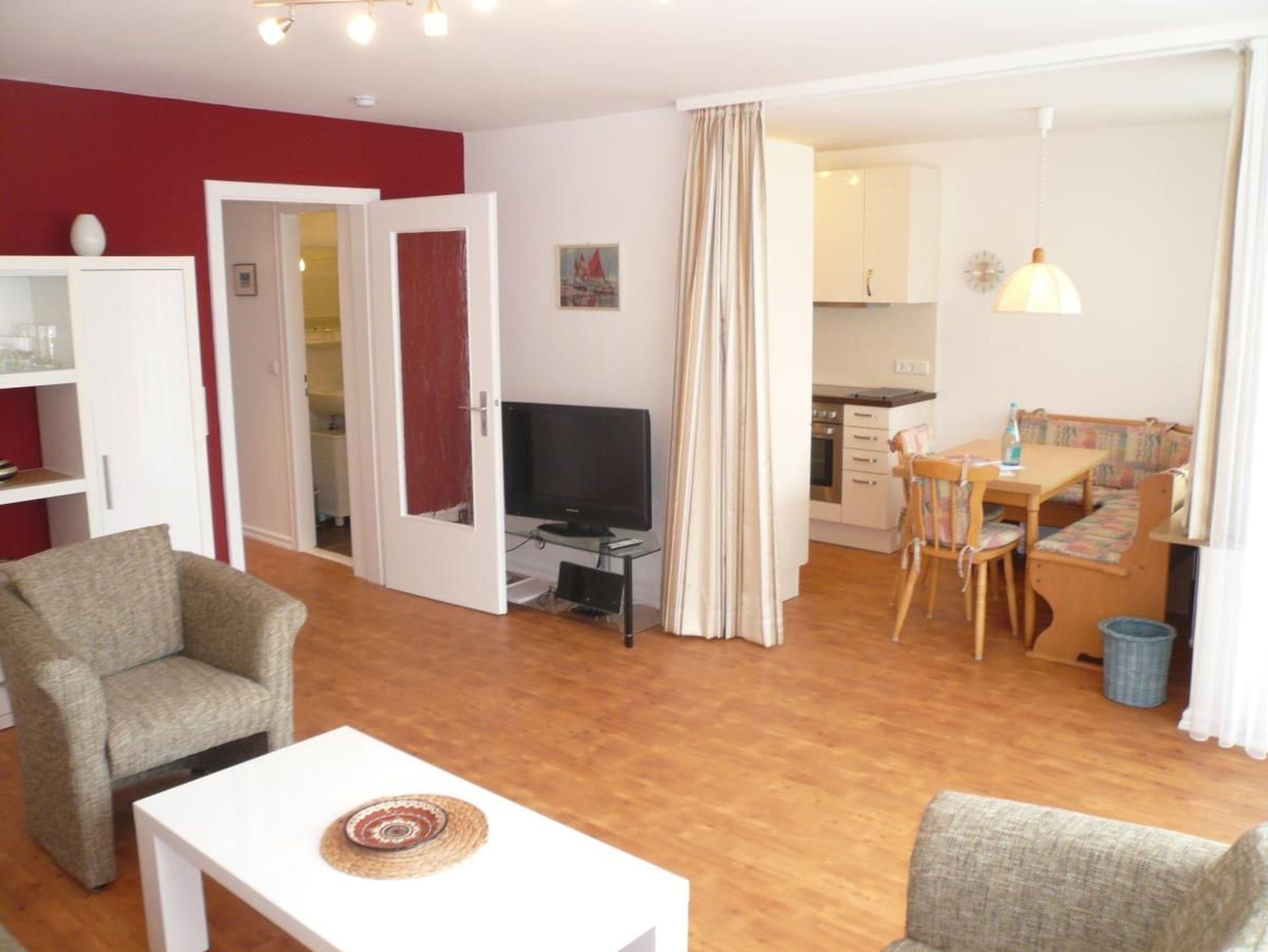 Im Wohnzimmer steht die neue Sitzgarnitur mit 2 Sesseln und bequemer Couch. Flachbild-TV und Kompaktanlage sind vorhanden. Am Südbalkon steht der Essplatz, daneben ist in einer Nische die neue Küche mit Geschirrspüler, 4er-Ceranfeld und Backofen untergebracht. Zwei Schlafzimmer sind vorhanden. In dem großen Schlafzimmer steht ein Doppelbett, in dem kleineren ein Etagenbett, in dem auch Erwachsene schlafen können. Das Bad hat eine großzügige Dusche.