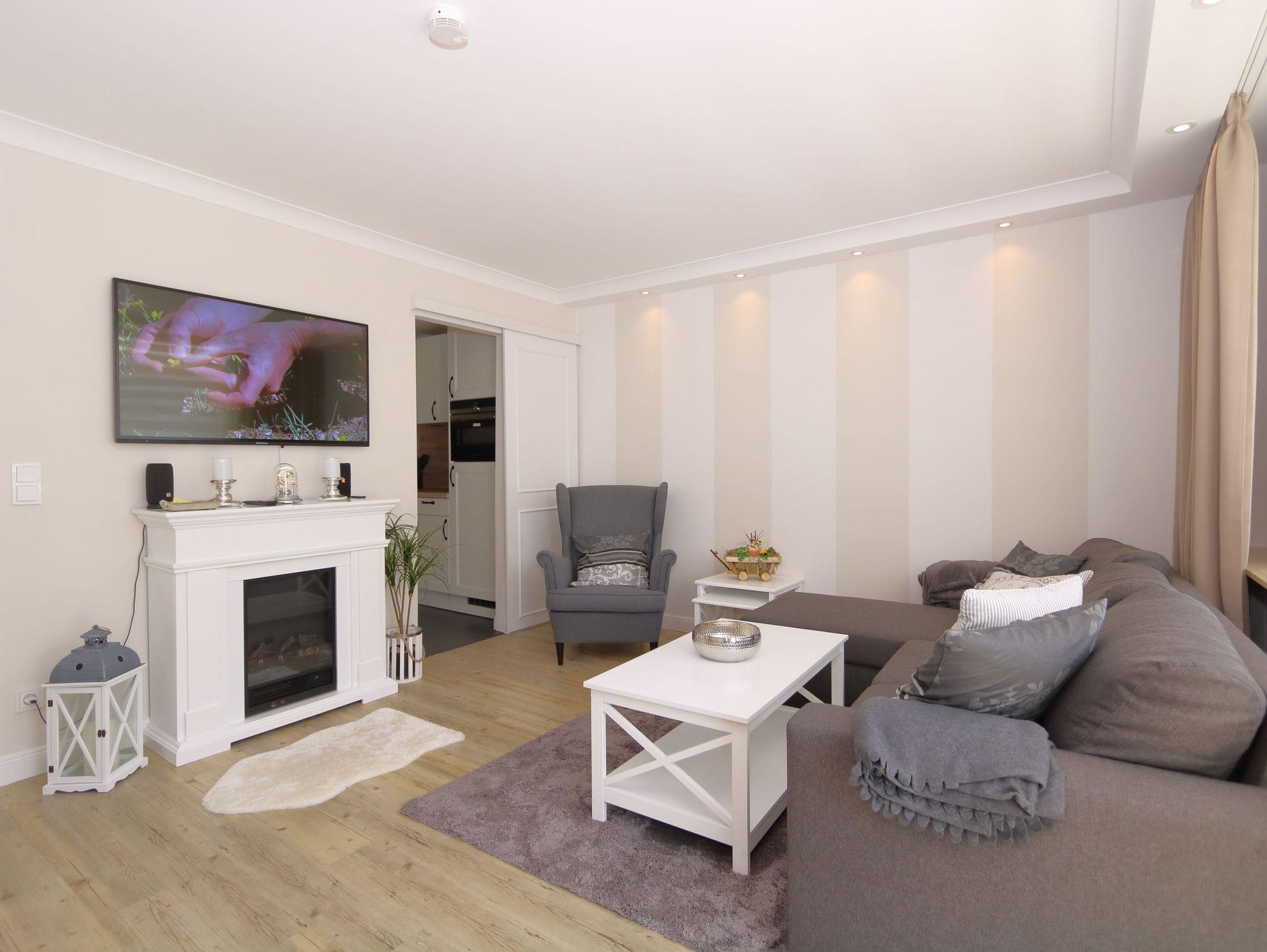 Im Wohnzimmer laden der Essbereich, eine gemütliche Sitzecke, welche man zum Doppelbett umbauen kann und ein Flachbildfernseher mit allen Zugängen für Netflix, Amazon und vielen mehr sowie ein Elektro-Kamin zum Verweilen ein.