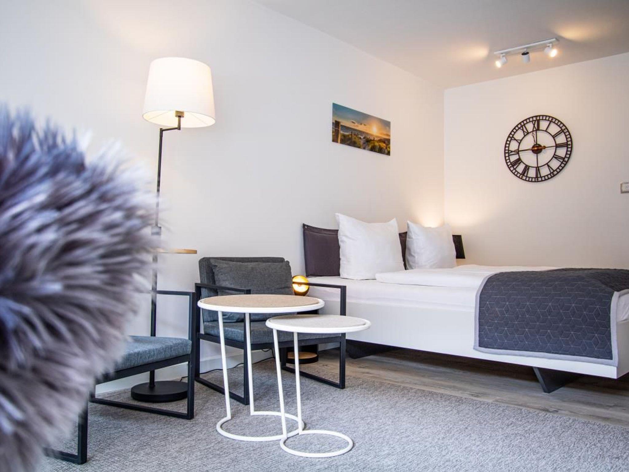 Im Wohnzimmer ist ein bequemes Doppelbett sowie ein Eßplatz am Fenster mit Stühlen und zwei bequemen Sesseln.