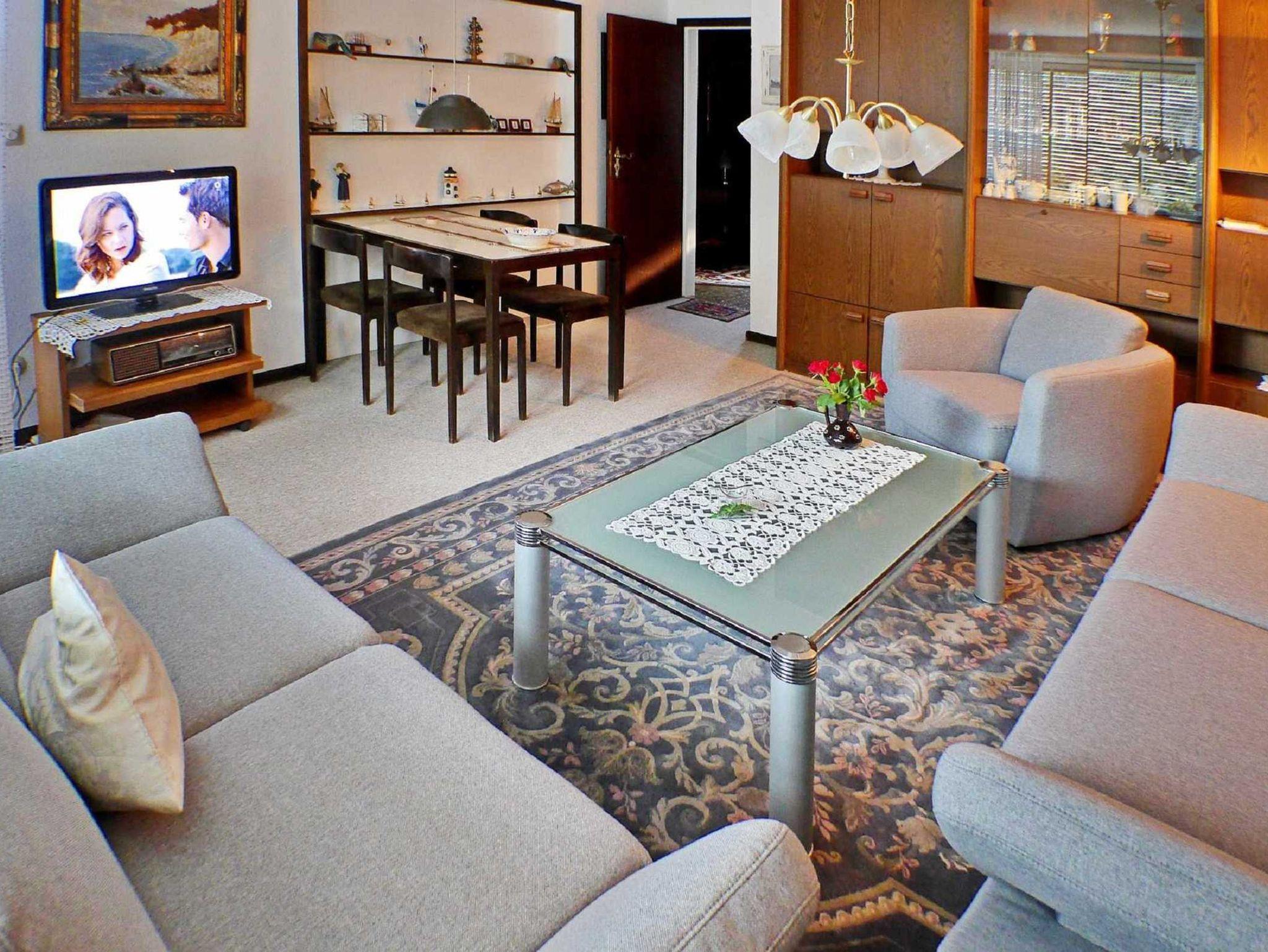 Das gemütliche Wohnzimmer ist mit Couchgarnitur, Flachbild-TV und Esstisch mit 4 Stühlen ist der Mittelpunkt dieser Wohnung.