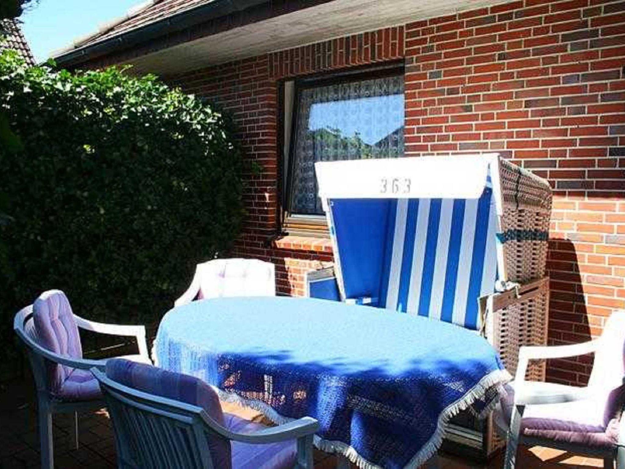 Eine Terrasse mit Sylter Strandkorb und Gartenmöbeln mit Süd/West Lage lädt zum Entspannen ein.