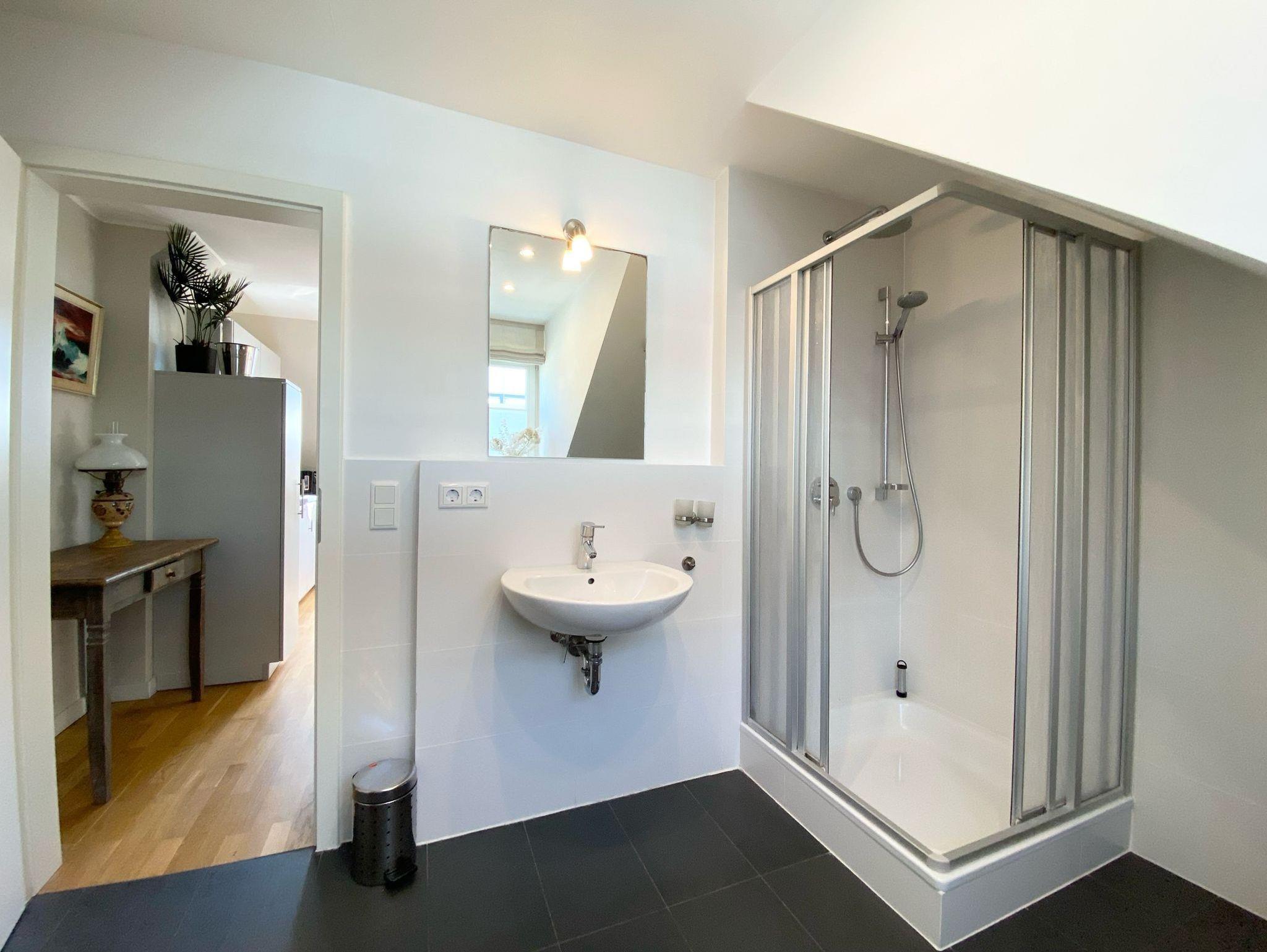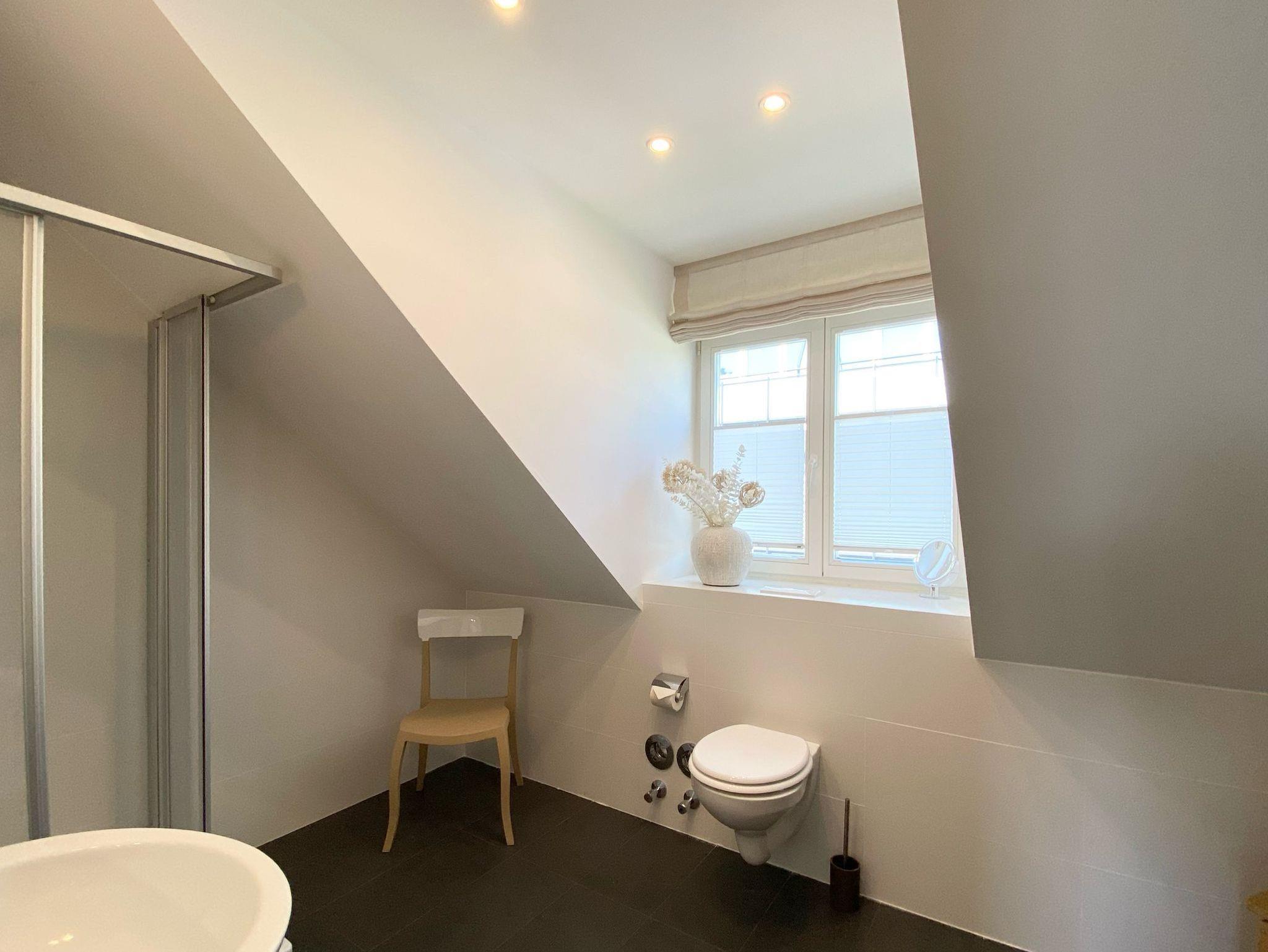 Das moderne Badezimmer ist mit einer Rainshower-Dusche, einem Handtuchwärmer, WC, Waschbecken und einem Haartrockner ausgestattet. Ein Außenfenster sorgt für frische Luft und natürliches Licht.