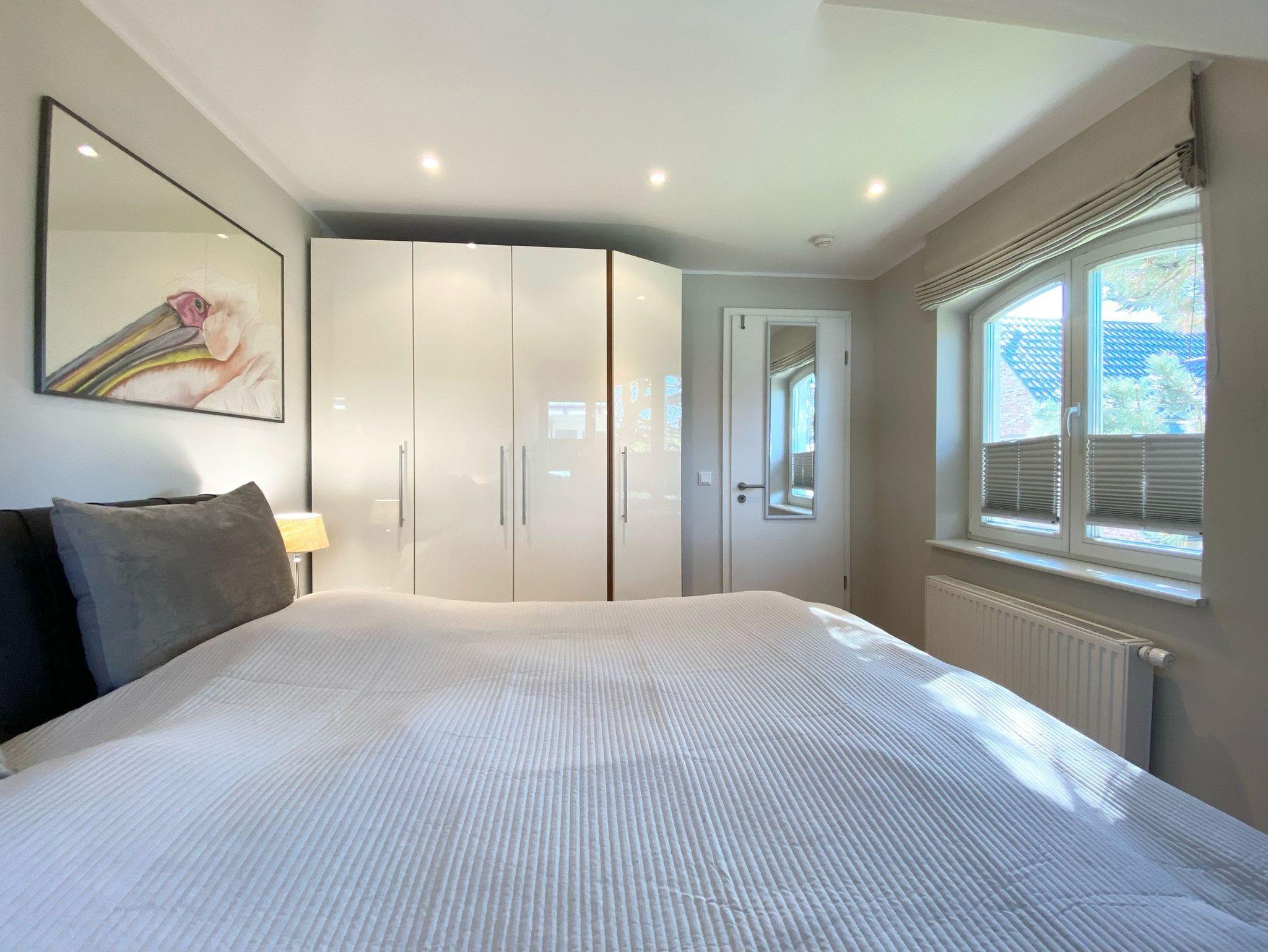 Im Schlafzimmer erwartet Sie ein komfortables Boxspringbett (180x200 cm) mit offenem Fußende, perfekt für einen tiefen und erholsamen Schlaf. Nachttische mit Leselampen und ein Kleiderschrank vervollständigen die Ausstattung.