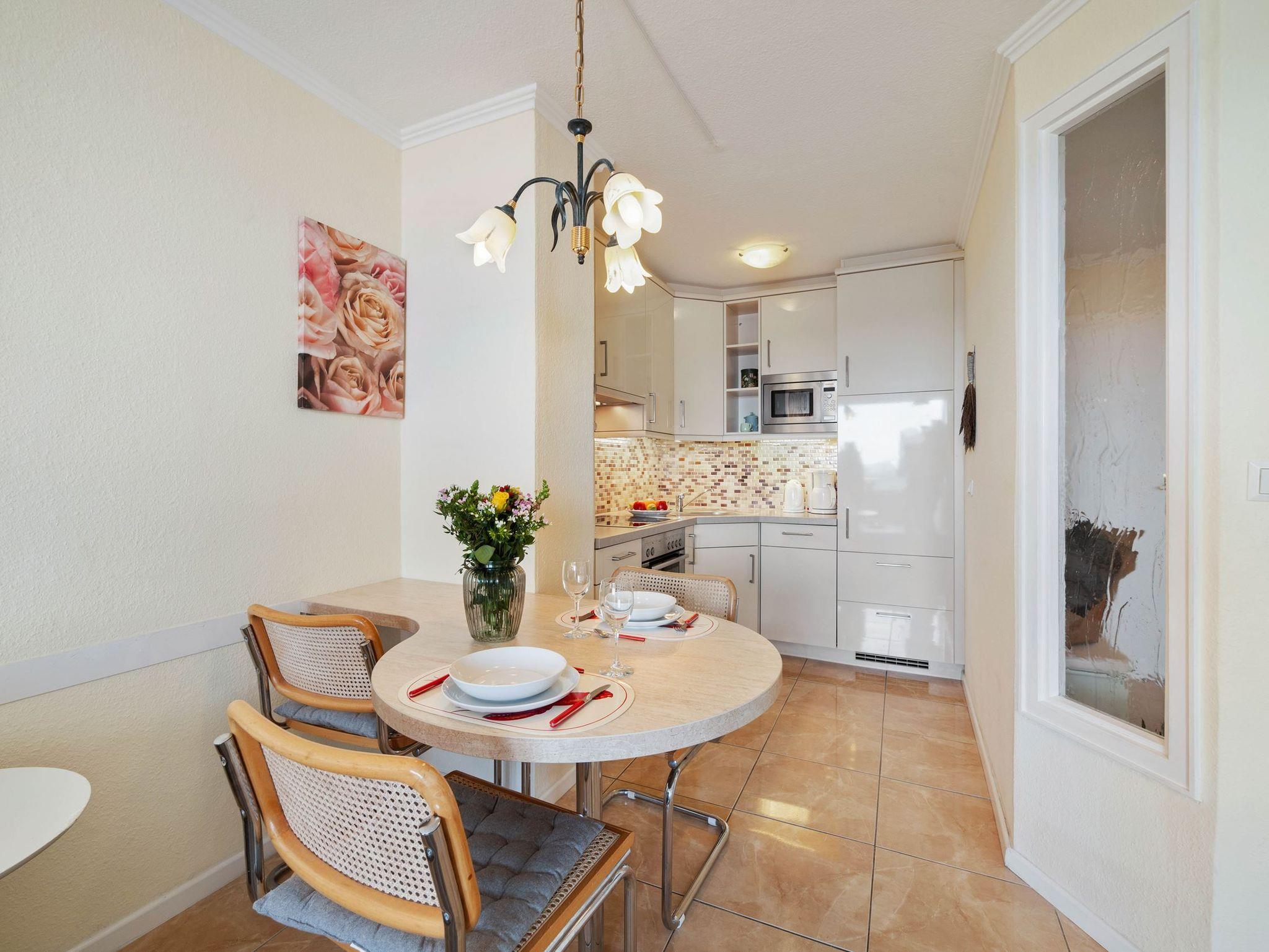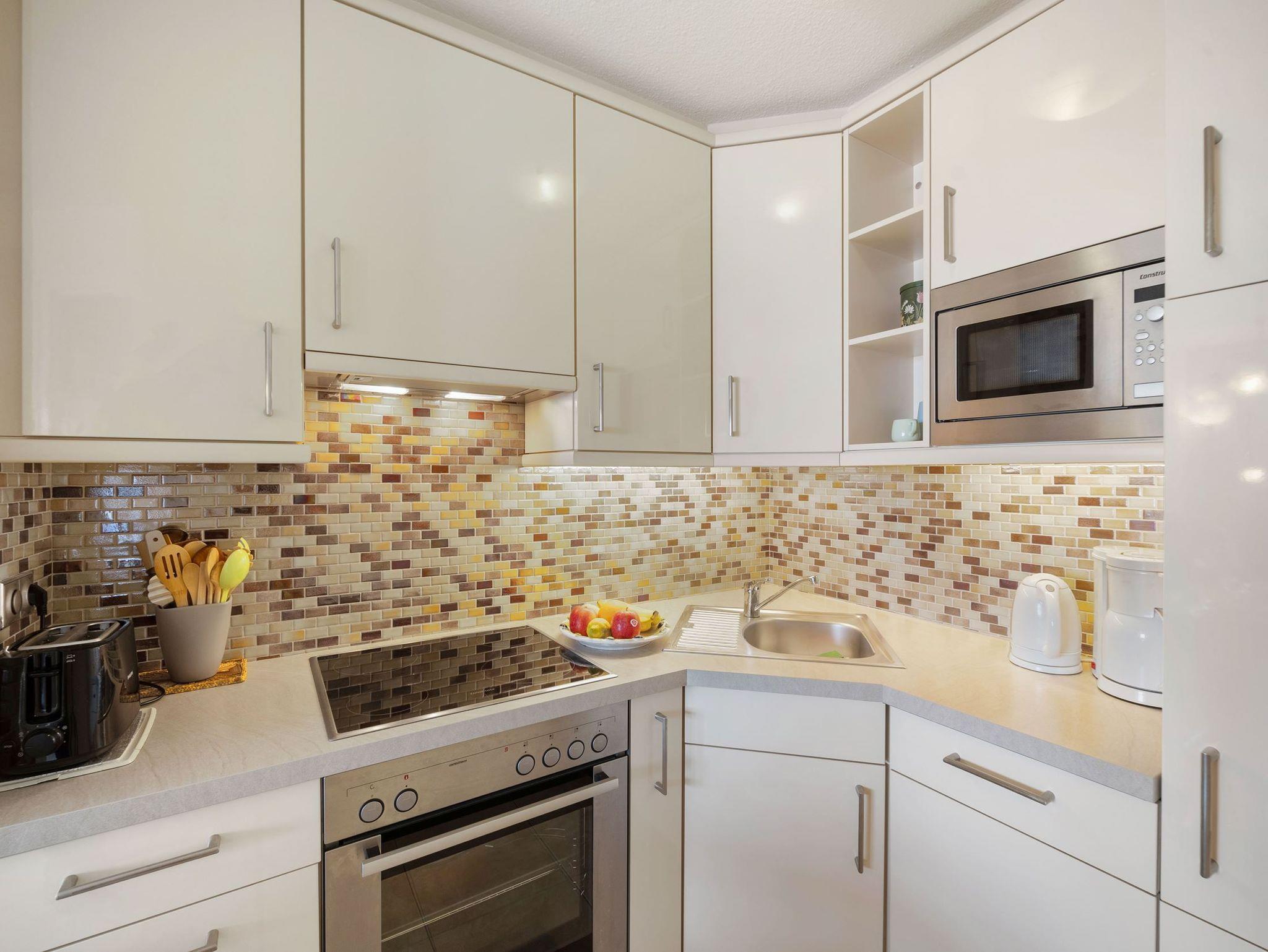 Die moderne Küchenzeile mit angrenzendem Essplatz ist mit einem Geschirrspüler, einer Mikrowelle, einem Backofen, Kaffeemaschine, Toaster und einem Wasserkocher ausgestattet.