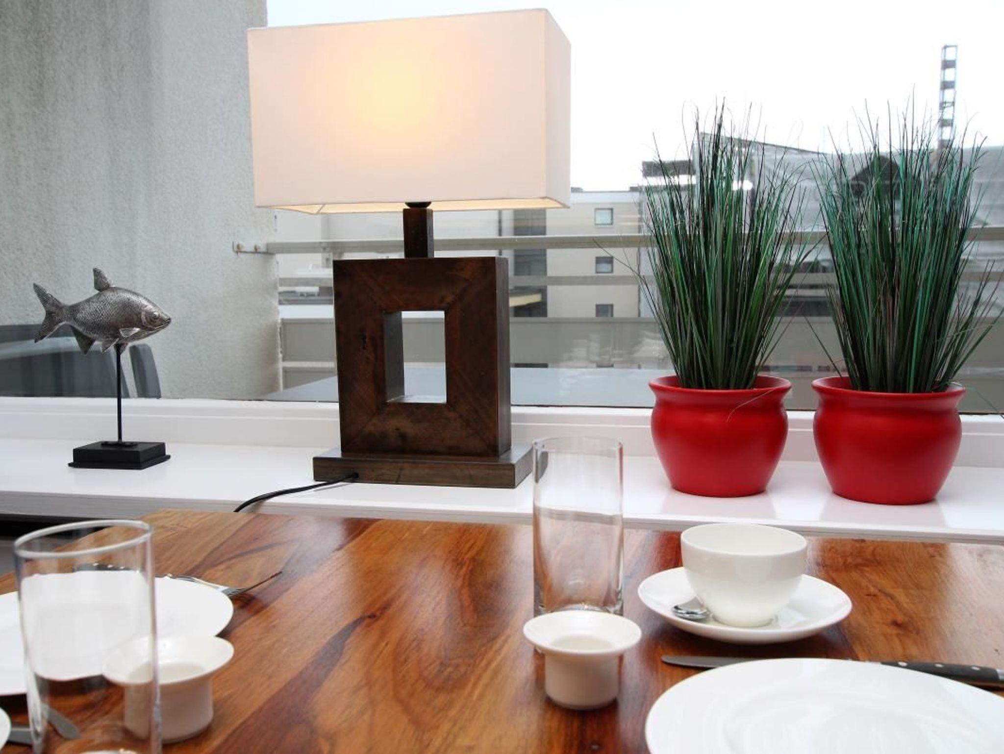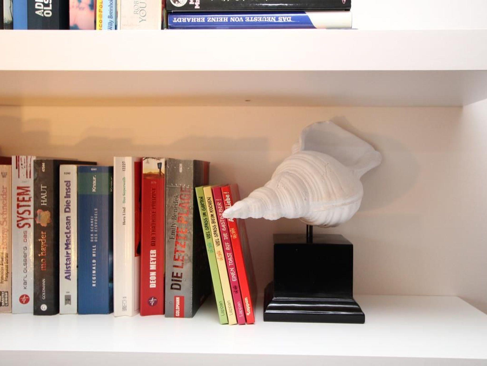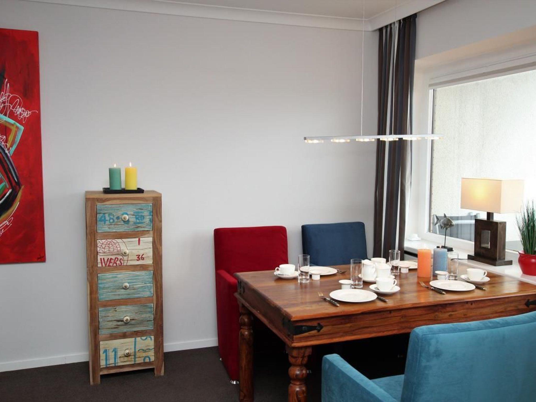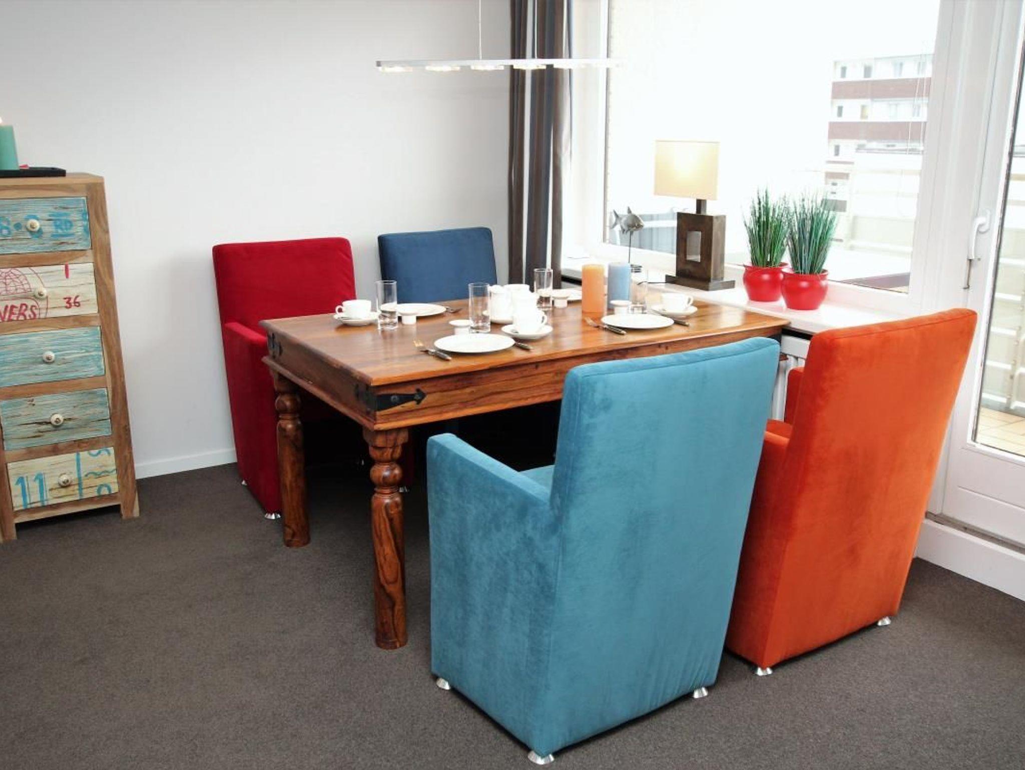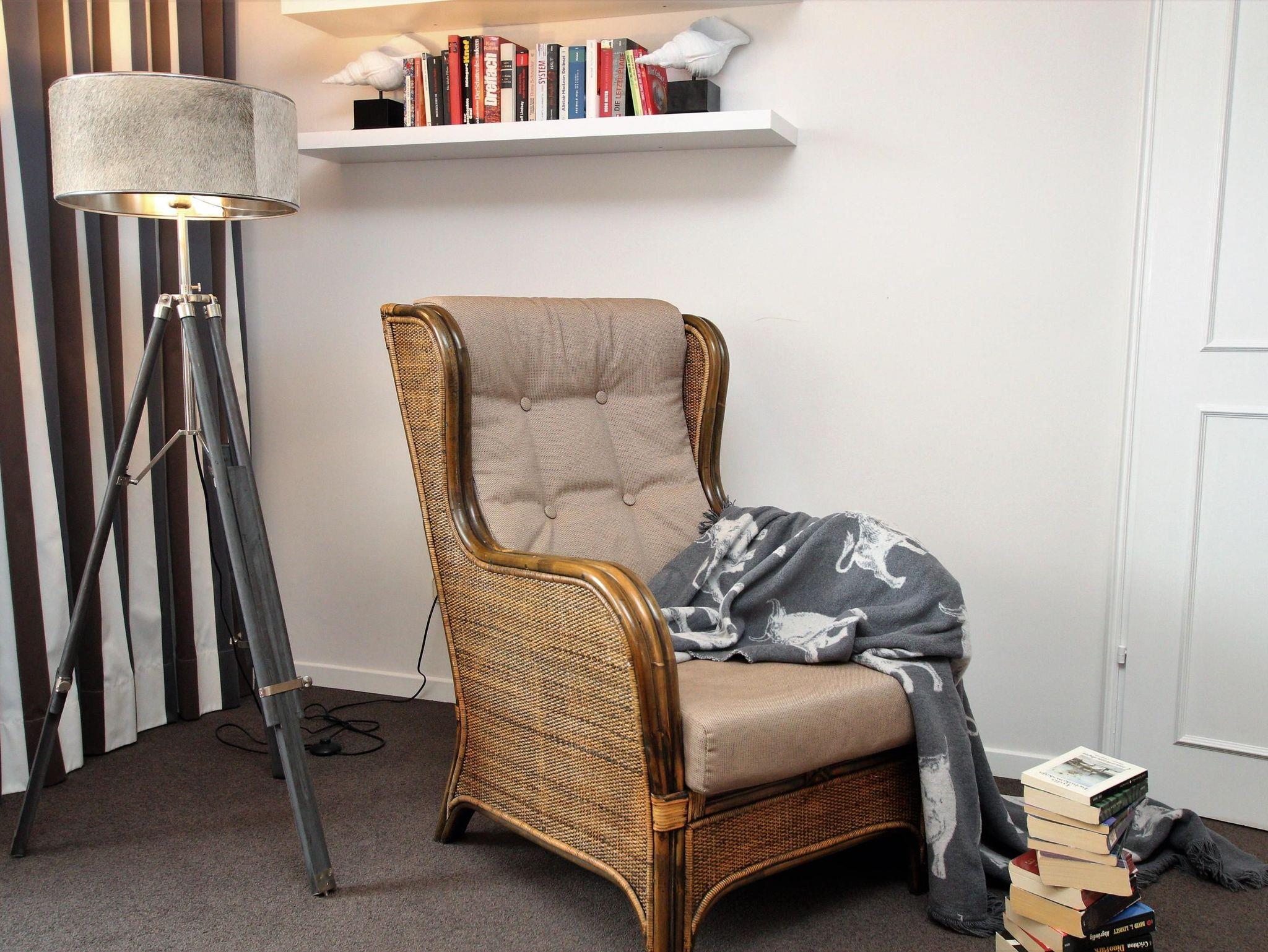 Ausstattung: Das Wohnzimmer ist u. a. mit einer Couch, die als Schlafsofa dienen kann, einem Sessel und dem Essplatz vor dem Fenster eingerichtet. Der große Westbalkon kann sowohl vom Wohnzimmer wie auch vom Schlafzimmer betreten werden. Im Schlafzimmer gibt es ein bequemes Doppelbett und einen großen Einbauschrank (mit TV). Die separate Küche ist mit allen notwendigen Geräten und Utensilien eingerichtet, hochwertiges Geschirr von Villeroy und Boch gehört ebenso dazu. Telefon mit Flatrate ins deutsche Festnetz vorhanden, wie ein Tivoli-Radio und CD-Player.