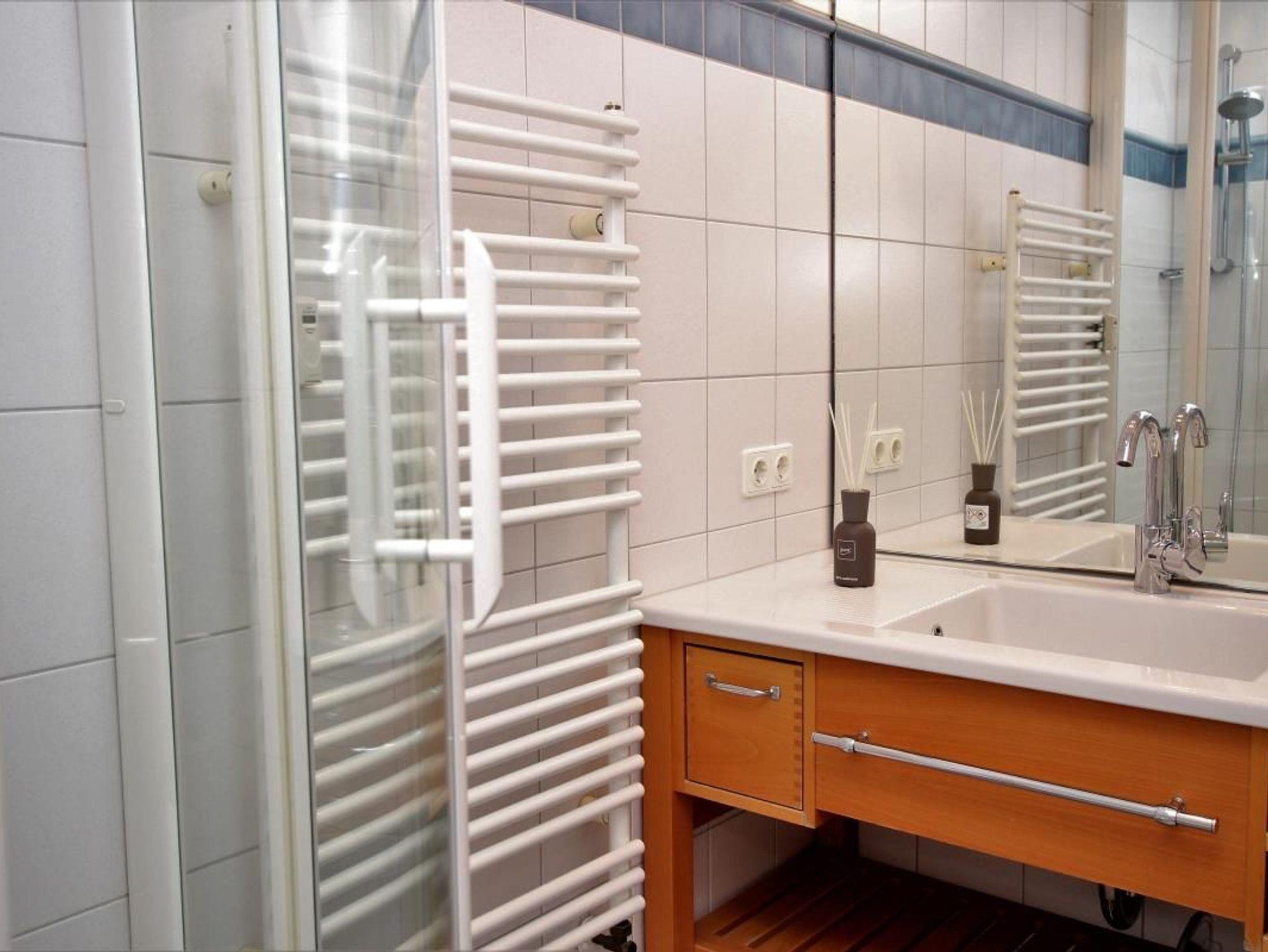 Das Bad hat eine Dusche und einen individuellen großen Waschtisch.