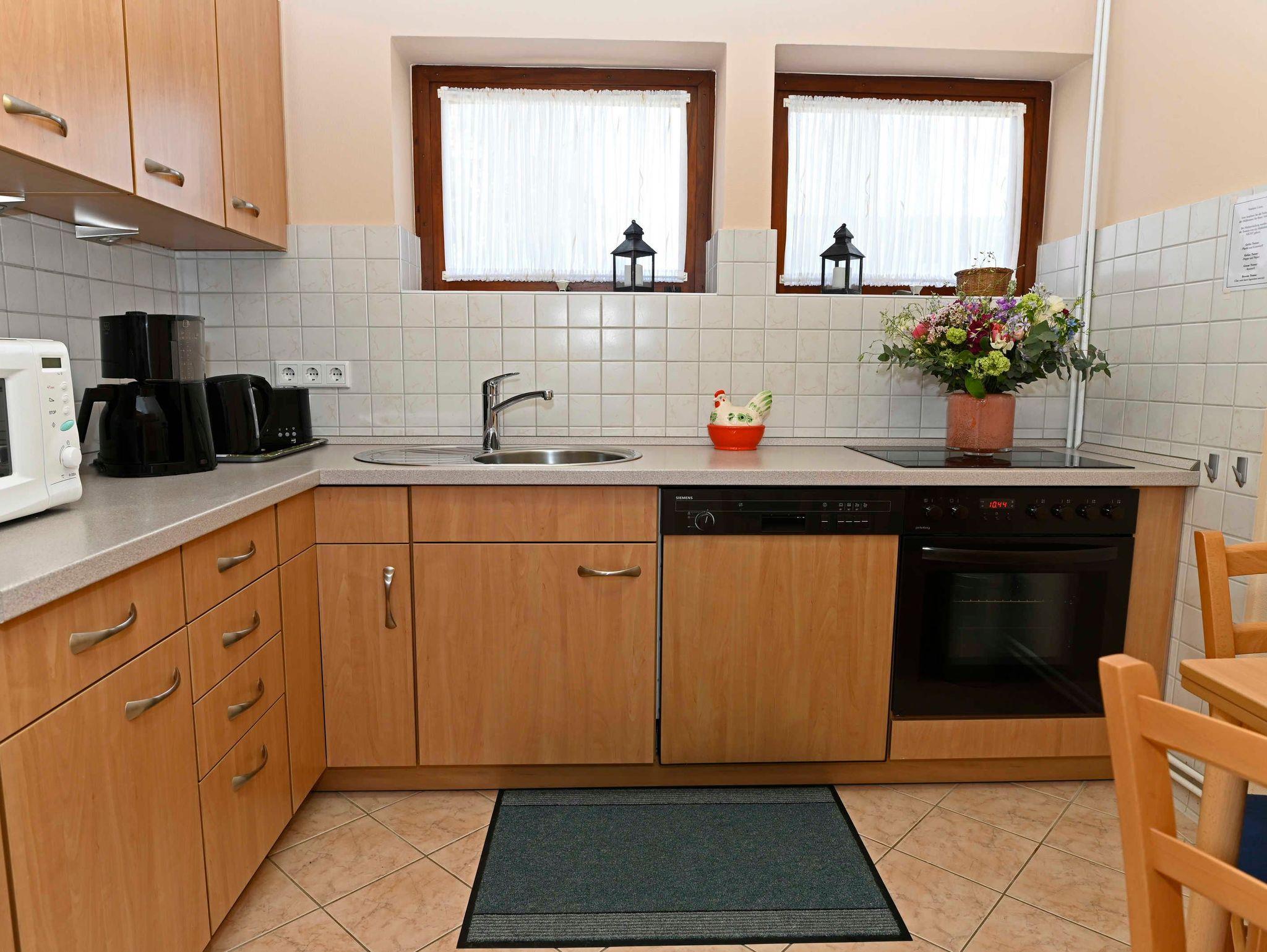 Separate Küche mit Essecke, Ceran-Kochfeld, Backofen, Geschirrspüler, Filter-Kaffeemaschine, elektrischer Wasserkocher, Toaster und Geschirr für den täglichen Bedarf sind selbstverständlich.
